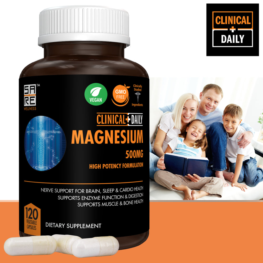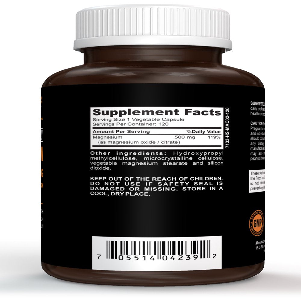 Magnesium is an essential mineral for optimal health and is well absorbed through the oral route, hence very effective as a dietary supplement in the form of magnesium pills, capsules or tablets. Magnesium deficiency is one of the leading nutrient deficiencies in men and women. The best magnesium supplement addresses these gaps. Our Magnesium Citrate & Oxide 500 mg formula is formulated for both men and woman to help balance this dietary gap. Why take Magnesium Citrate and Oxide blend - Magnesium supplements are available in a variety of forms including magnesium sulfate, magnesium glycinate, magnesium caltrate, magnes citrate, calcium magnesium, mag citrate, mgnesium citrate, magnesium citrate liquid for colonoscopy prep, liquid magnesium oxide, magnesium citrate powder, magnesium threonate, magnesium chloride, magnesium malate and magnesium chelate in a variety of doses 250mg, magnesium 400 mg or much higher for laxative needs, typically in the form of magnesium oxide or magnesium citrate for constipation. Our Magnesium Citrate 500mg capsules deliver what you need for daily supplementation to close your dietary gaps. This magnesium supplement combines both magnesium citrate and oxide in 500mg capsules to ensure you get two forms of magnesium. Our Magnesium capsules are convenient and easy to swallow. CLINICAL DAILY's magnesium product gives you the benefit of two effective forms of magnesium in one small capsule per day! CLINICAL DAILY Magnesium Oxide and Magnesium Citrate pills are manufactured in a Good Manufacturing Practices (GMP) certified plant. We offer a no questions asked 100% 365 day money back guarantee because we are very confident you will love our magnesium vitamin. Try our Premium Magnesium Supplement today.