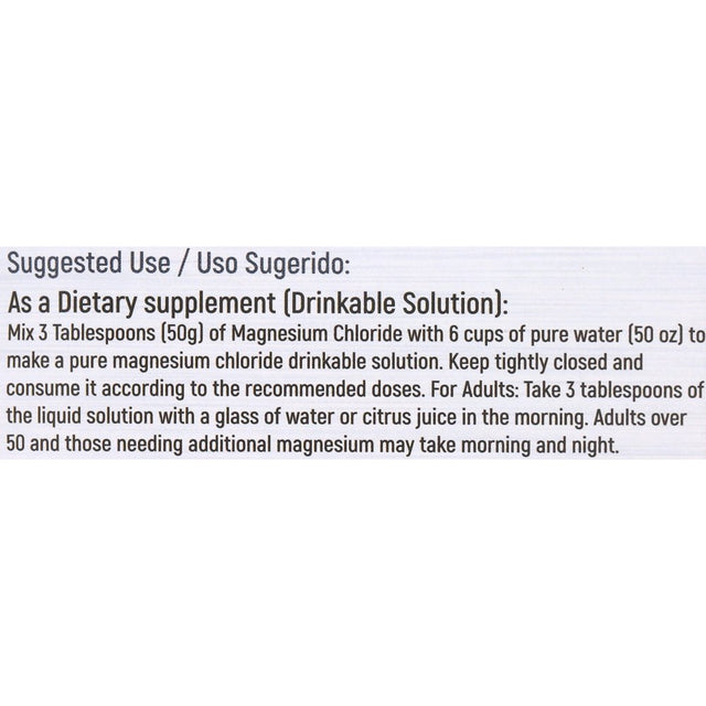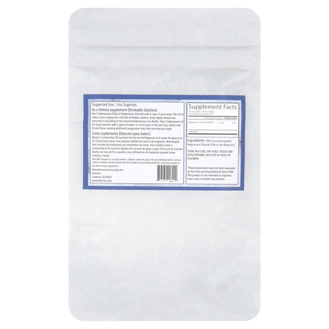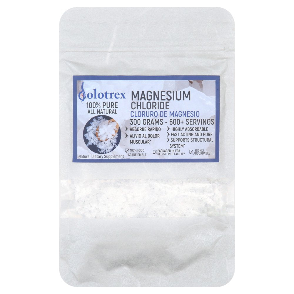 Magnesium Chloride Flakes (Powder) Cloruro de Magnesio Puro Ingerible PURE Pharmaceutical Grade Over 600 Servings 300 grams (10.58 Oz). Dolotrex Pure Magnesium Chloride Pharmaceutical Grade flakes (salt) is an Edible food grade Magnesium supplement to help to remedy magnesium quickly and safely. Dolotrex Magesium comes in a LARGE 300g (0.66 Lb) resealable food grade bag to keep it fresh. This product is Pure and Safe to consume by mixing it with water and drinking it as indicated. It can also be made into MAGNESIUM OIL for topical application and trans dermal absorption. Pure Magnesium Chloride supplement is a fantastic way to alleviate magnesium deficiency and the conditions associated with it such as Muscle Pain, Joint aches and inflammation along with other nervous and body symptoms. Available in a powder form, you can enjoy a full dose on a daily basis by dissolving it into a beverage of your choice. Perfect in water, juice, or club soda, a small amount is all it takes to start seeing fantastic changes. HOW TO USE: Mix 3 tablespoons of Magnesium chloride with 6 cups of pure water to make a magnesium chloride drinkable solution. For adults 40 years of age and older take a shot (25ml) before breakfast. ===ESPANOL=====Mas de 600 porciones de Cloruro de Magnesio Puro de la Mejor Calidad y comestible - 300g en total. Cloruro de Magnesio aporta muchos beneficios incluyendo: Ayuda a relajar musculos, minimizar dolores musculares y de articulaciones y mucho mas. Dolotrex Cloruro de Magnesio contiene 300g en una bolsa apta para comida Resellable para mantener el Cloruro de Magnesio puro y activo y ayudar a eliminar la deficiencia de magnesio de una forma rapida y natural. Puedes usarlo tomado o puedes diluirlo en agua y crear ACEITE DE CLORURO para aplicar sobre la piel, dar masaje y absorber de forma trans dermal. COMO SE USA: Disuelva el contenido de un sobre (50g) en 1.5 litros de agua (51 oz de agua) purificada. Para adultos de 40 o mas tomar 1/2 copita (25 ml) en ayunas - el quivalente a un shot tequilero. Recomendacion general para diferentes edades: De 10 a 39 aos: dosis. De 40 a 70 aos: 1 dosis a la maana. De 71 en adelante: Una dosis a la maana y otra a la noche Las dosis son generales y usted puede ajustarla como sea necesario (mas o menos).