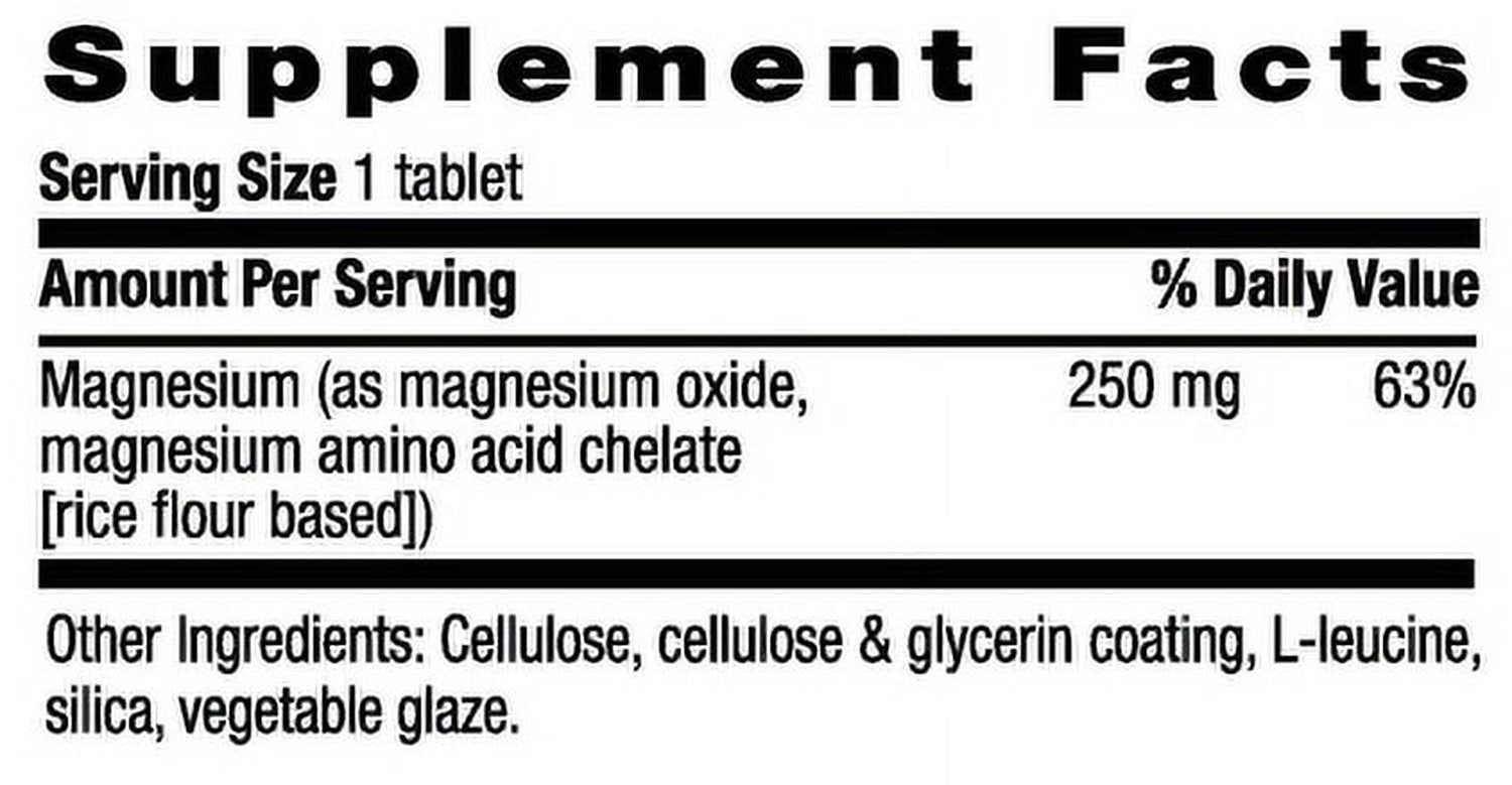 Established 1971 Certified Gluten-Free Helps Relax Muscles Supports Bone Health Dietary Supplement Kosher Certified B Corporation igen Non-GMO Tested — Our Pledge of Integrity — Authenticity Cleanliness Freshness Consistency Accuracy Magnesium is needed for more than 300 biochemical reactions in the body and helps to relax muscles and to maintain an already normal blood flow. It can also support a steady heart rhythm and a healthy immune system, as well as keep bones strong. YES Certified Gluten-Free by GFCO. org NO Yeast, Wheat or Corn YES Certified Vegetarian by the AVA NO Soy, Milk or Salt YES Recyclable Packaging NO Sugar or Preservatives YES Manufacturing Supports Wind Power NO Artificial Colors, Flavors or Artificial Sweeteners YES Kosher NO Magnesium Stearate This product has been manufactured at a GMP Registered facility.
