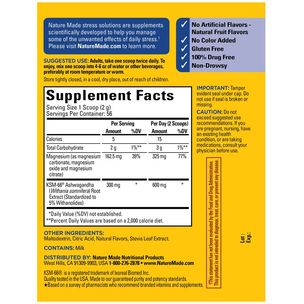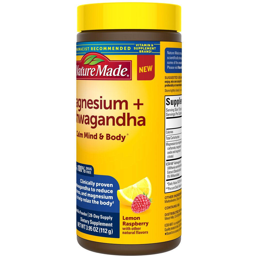 Nature Made Magnesium Plus Ashwagandha Calm Mind and Body is a dietary supplement that combines KSM-66 Ashwagandha root powder with calm Magnesium powder in a delicious powdered drink mix that offers stress relief for the mind and body. Sourced from high-quality ingredients, this Nature Made Ashwagandha and Magnesium supplement powder is a gluten free, non-drowsy, 100% drug free stress supplement with no artificial flavors and no color added. Nature Made’s calm magnesium powder contains clinically studied Ashwaganda to help reduce stress. This powder drink mix also contains Magnesium, an essential mineral that plays an important role in more than 300 reactions in the body, including its ability to help relax the body. With a great-tasting lemon raspberry flavor with other natural flavors, this Magnesium drink powder also helps support your daily hydration needs when mixed with water. Adults, take one scoop of this Magnesium and Ashwagandha supplement twice daily. To enjoy, mix one scoop into 4-6 oz of water or other beverages, preferably at room temperature or warm. Nature Made supplements are quality you can trust. *Based on a survey of pharmacists who recommend branded vitamins and supplements. KSM-66® is a registered trademark of Ixoreal Biomed Inc.