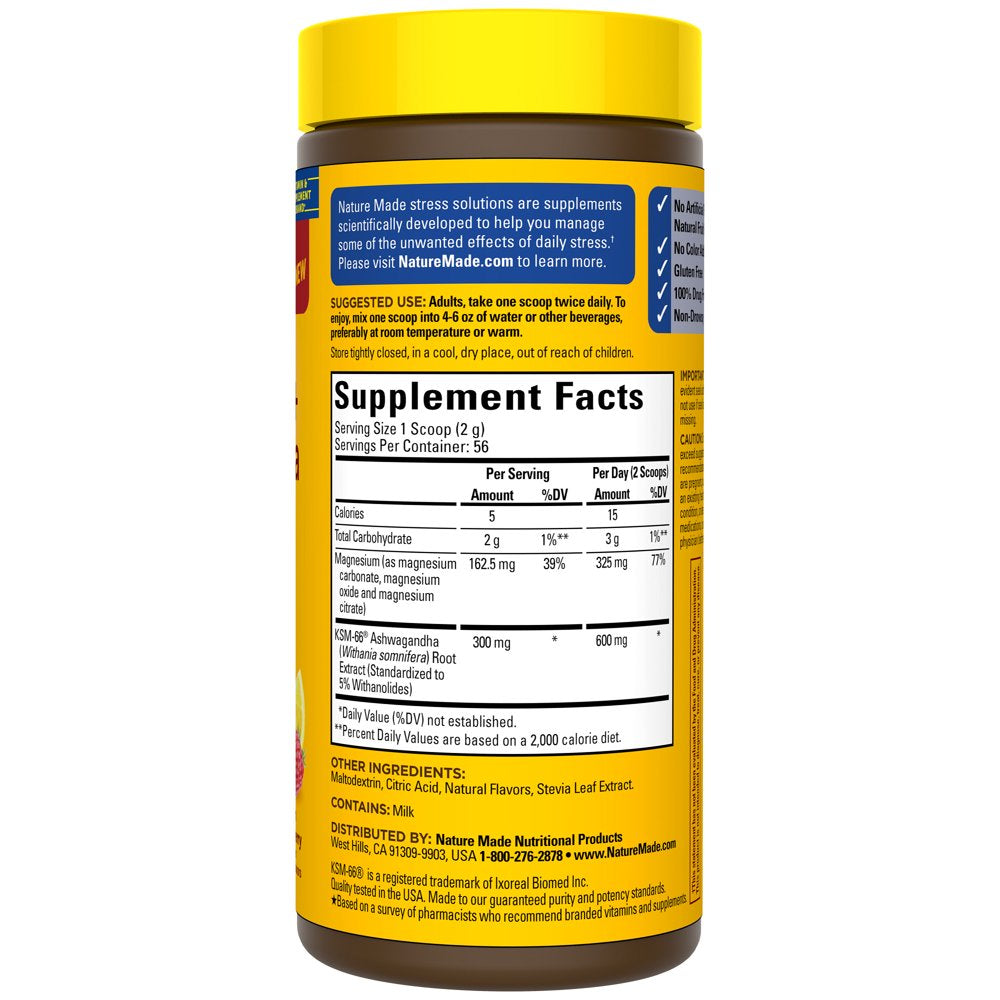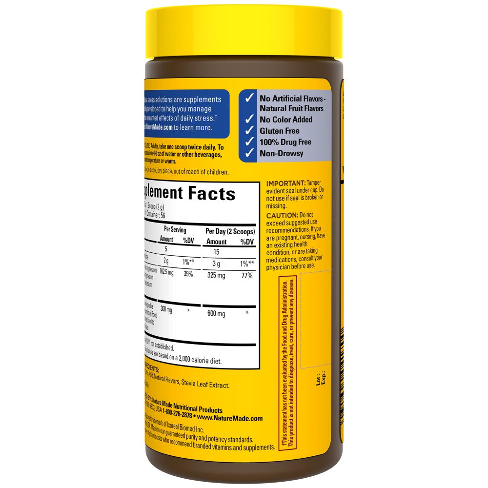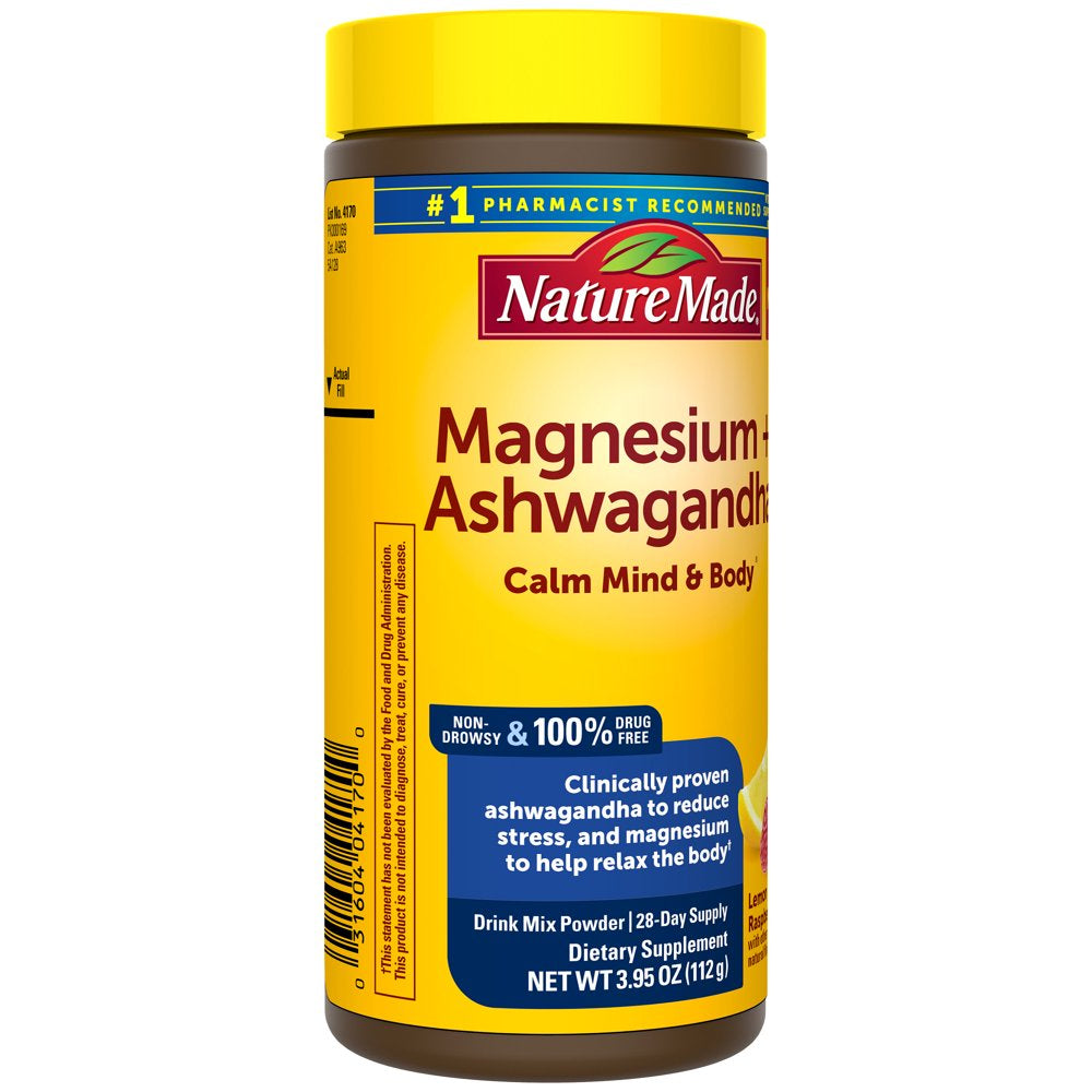 - Stress support supplement: contains one 56 serving bottle of Nature Made Magnesium Plus Ashwagandha Calm Mind and Body Drink Mix Powder for a 28-day supply