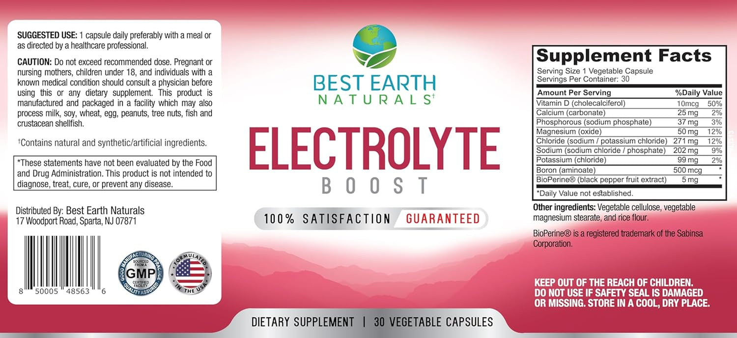 - Electrolyte Boost contains BioPerine, Vitamin D, Calcium, Phosphorus, Magnesium, Chloride, Sodium, Potassium, Boron and many more.