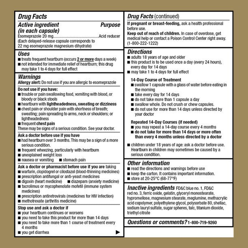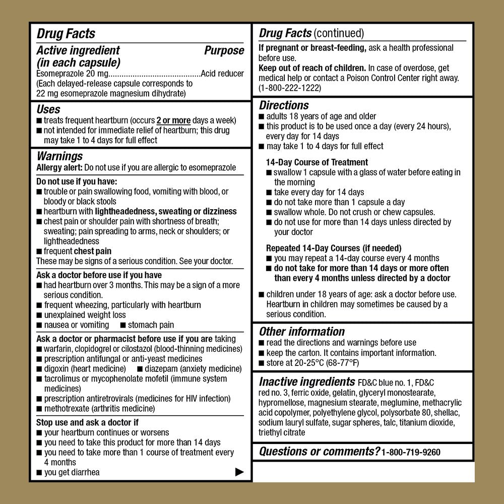 Compare to the active ingredient of Nexium 24 HR. Don't let frequent heartburn keep you from enjoying the flavorful delicacies of life. GoodSense Esomeprazole Magnesium Delayed Release Capsules, 20 mg works around the clock to make sure frequent heartburn doesn't make you miss out on your favorite foods. This product is clinically proven to treat frequent heartburn occurring 2 or more days per week, and is taken once every 24 hours for 14 days. Not intended for immediate relief of heartburn; this drug may take 1 to 4 days for full effect. This product is gluten free. The active ingredient is esomeprazole, 20 mg, an acid reducer.