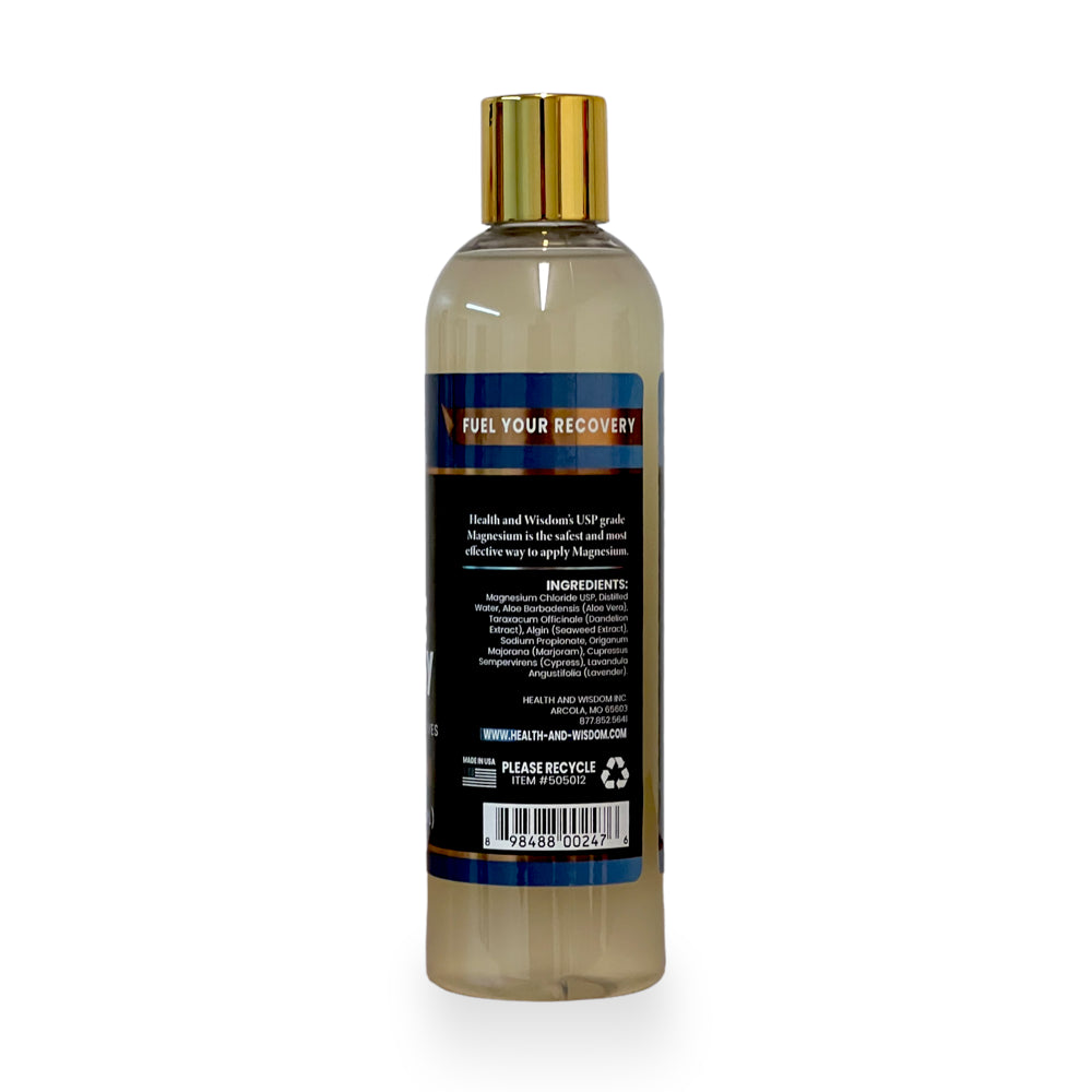 Health and Wisdom Magnesium Muscle Recovery is a unique product designed to help you get more out of your workout! All-Natural USP Grade Magnesium Chloride, Aloe Vera, Dandelion, Seaweed Extract and pure essential oils come together to make a whole new way to support your body and up your game! • For external use only. Keep out of the reach of children. • Avoid contact with eyes, mucus membranes, and broken or irritated skin. • Shake before use Before workouts: Apply Magnesium Muscle Recovery to muscles and rub in to support better, longer workouts. It is normal to feel slight tackiness on the skin as these natural ingredients absorb. The product may be left on during the workout or washed off 20 minutes after application. After workouts: Apply Magnesium Muscle Recovery to muscles and rub in to support better muscle recovery. Product may be left on the skin or washed off after 20-30 minutes for best results.