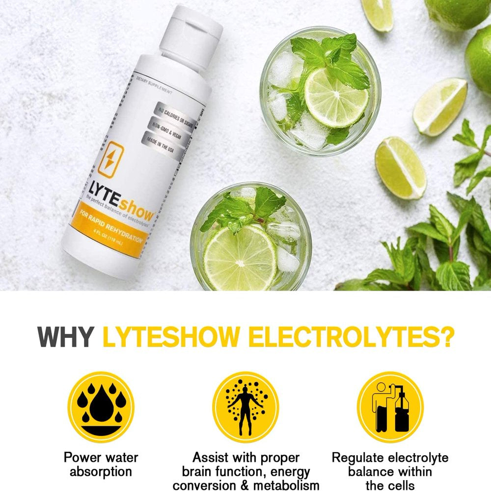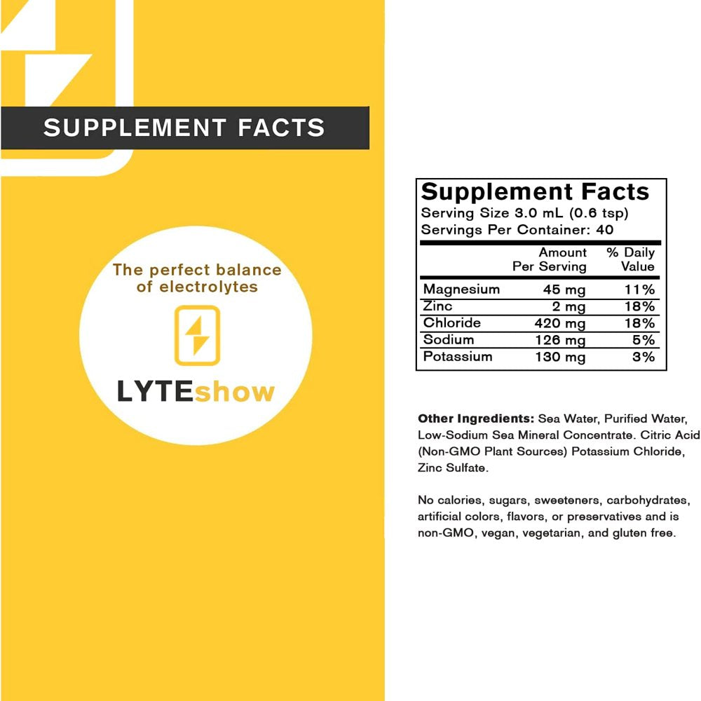 RAPID REHYDRATION - Add LYTEshow ionic liquid concentrate to 32 oz. of water to create an isotonic beverage that rapidly replaces a full balance of electrolytes and fluids.,COMPLETE ELECTROLYTE FORMULA Includes ionic magnesium, an essential electrolyte known to be critical for energy conversion, muscle function and nerve conduction. Plus sodium, chloride, potassium electrolytes, trace minerals and zinc.,DON T GET RUN DOWN - Formulated with zinc, known to provide immune support while electrolytes help with muscle recovery and energy, fluid balance regulation within the cells, and proper brain function for energy conversion and metabolism.,JUST THE STUFF YOU NEED - You won't find calories, sugars, sweeteners, carbohydrates, artificial colors, flavors, or preservatives here! Non-GMO, Gluten Free, Vegan, Keto Friendly & Whole30 Approved. 3rd Party Tested and Made in the USA.,FLAVOR: Slightly tart and salty. Can be added to either cold or hot water as well as to smoothies, tea, and even carbonated beverages. If you're sensitive to the mineral flavor, we recommend adding less or mix with a squeeze of lemon or splash of juice!