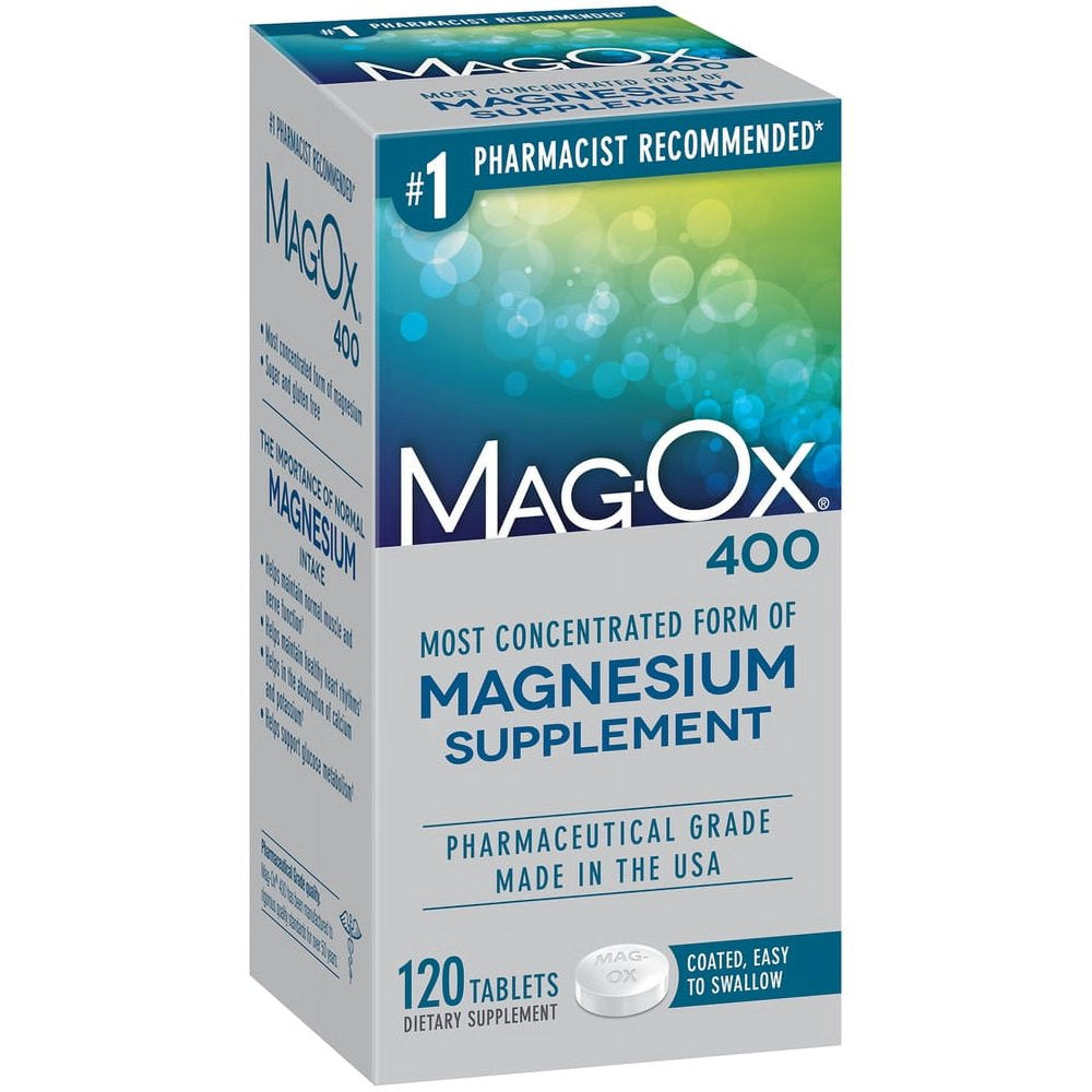 Mag-Ox is a mineral supplement made from magnesium oxide – the most concentrated form of magnesium available: Mag-Ox is the no.1 pharmacist recommended magnesium supplement used throughout the body for a wide variety of functions. Magnesium supports over 300 chemical reactions in the body – and Mag-Ox is at the center of them all: Magnesium is critical in helping convert carbohydrates, protein and fat into energy – helping support the formation and release of energy from cells. Normal magnesium intake helps maintain normal muscle and nerve function** as well as maintain healthy heart rhythms.**Mag-Ox delivers the purest form of magnesium, to help you live a longer, healthier life: Mag-Ox magnesium tablets are sugar free, gluten free, and do not contain corn, soy, milk, eggs, shellfish, fish, yeast or animal byproducts. Mag-Ox magnesium supplements are coated for easy swallowing; take 2 tablets daily with food or as directed by a healthcare professional; you may only need to take 1 tablet per day. *Inconsistent and inconclusive scientific evidence suggests diets with adequate magnesium. Mag Ox is manufactured to rigorous quality standards for over 50 years. Mag-Ox 400 Magnesium Oxide Dietary Mineral Supplement Tablets come in counts of 60 and 120 for your convenience. **These statements have not been evaluated by the Food and Drug Administration. This product is not intended to diagnose, treat, cure, or prevent any disease.