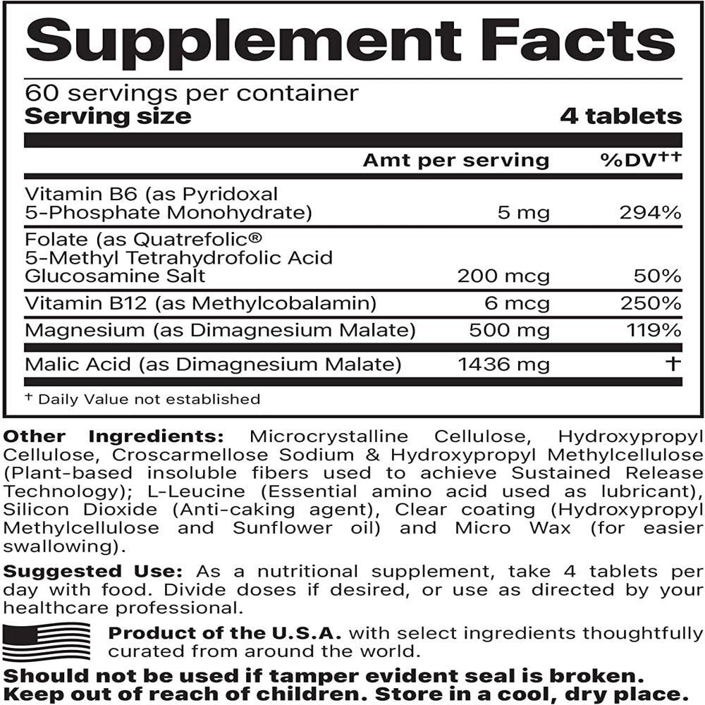 Magnesium (as dimagnesium malate), Vitamin C (as ascorbyl palmitate), Vitamin B6 (as pyridoxal-5-phosphate), Folate (as Quatrefolic® 5MTHF), Vitamin B12 (as Methylcobalamin), Malic Acid (as dimagnesium malate).
