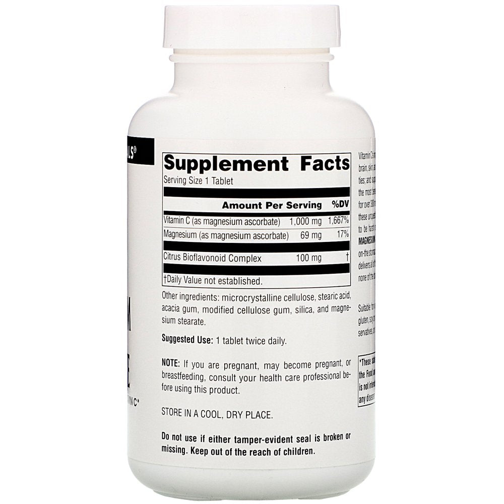 Dietary Supplement Gentle Non-Acidic Vitamin C Suitable for Vegetarians Vitamin C's importance has been established: heart, joints, brain, skin, and immune system health; antioxidant activities; and support for healthy aging. Magnesium is one of the most beneficial minerals known to man, responsible for over 300 metabolic reactions in the body. But even with these unquestioned benefits, many people find vitamin C to be harsh on the stomach. Source Naturals presents Magnesium Ascorbate, a buffered, non-acidic, easy-on-the stomach form of vitamin C in a 1,000 mg tablet that delivers all of the benefits of magnesium and vitamin C and none of the drawbacks.