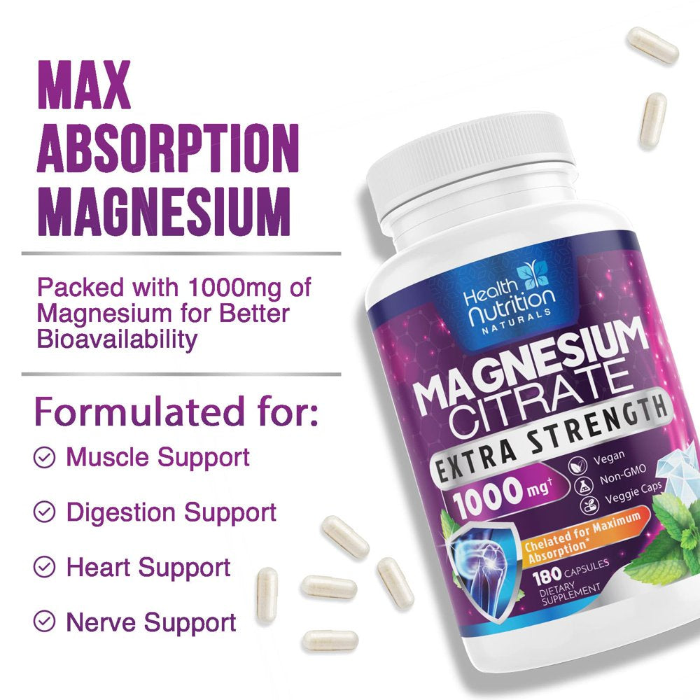Magnesium Citrate Capsules 1000Mg - Max Absorption Magnesium Powder Capsules for Muscle, Nerve, Bone and Heart Health Support, High Absorption Citrate Complex, Gluten Free, Non-Gmo - 180 Capsules