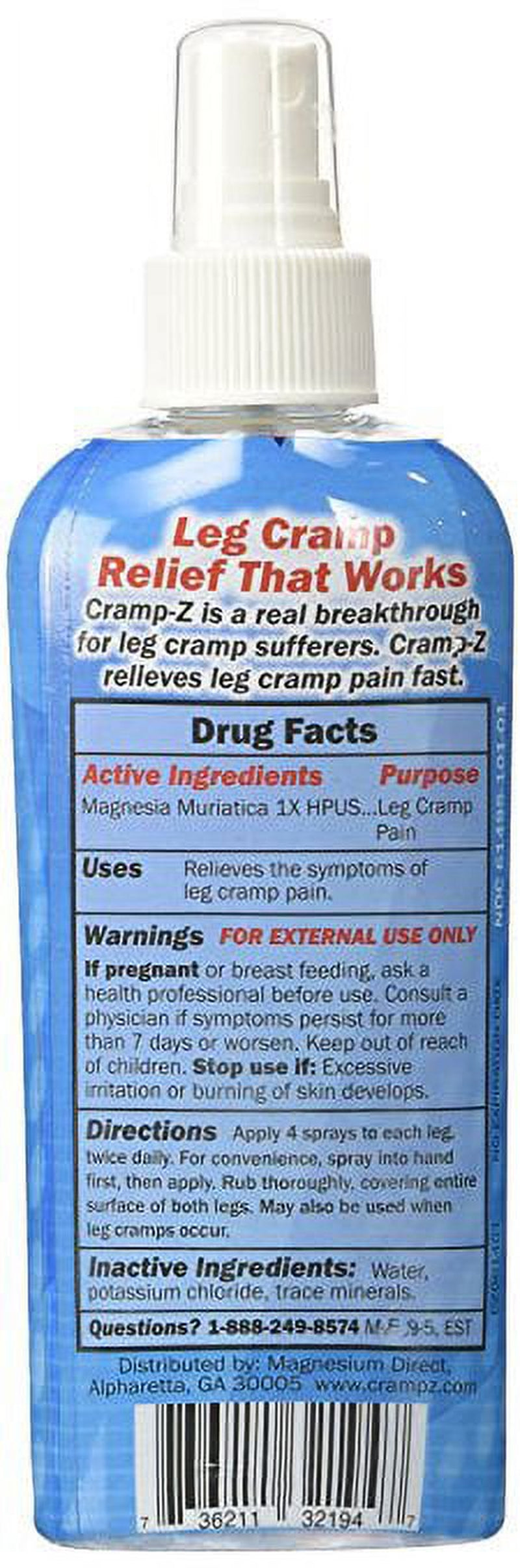Spray Away Painful Leg Cramps Relieve painful leg cramps with Crampz, the world's #1 topical leg cramp treatment! This odorless, greaseless, 100% natural formula eliminates cramps and prevents them from coming back. Simply spray it on your legs twice daily to give your body the magnesium it needs to keep your leg muscles relaxed and flexible.