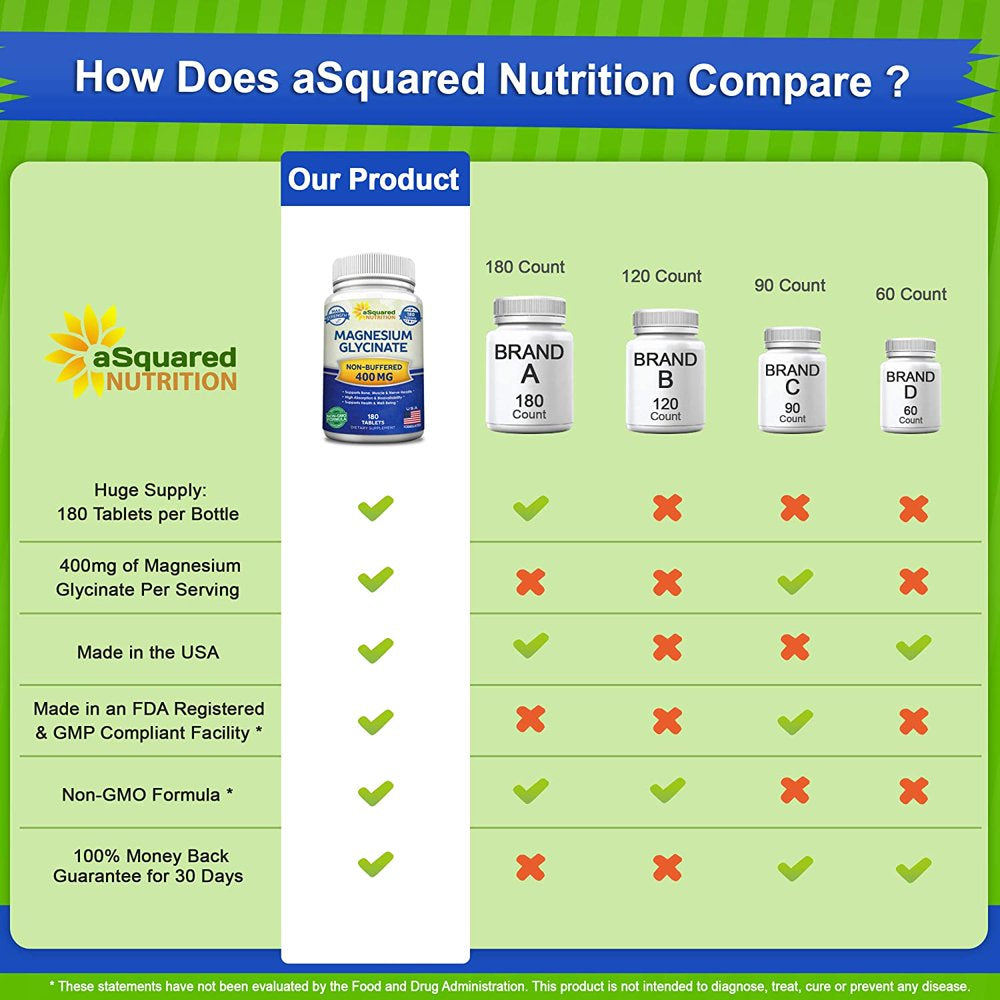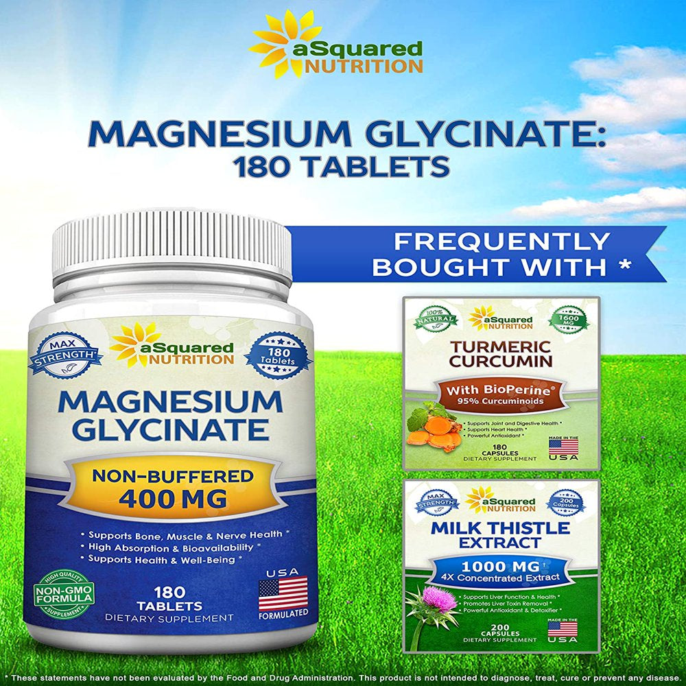 MAX STRENGTH MAGNESIUM GLYCINATE: aSquared Nutrition's Non-GMO, maximum strength Magnesium Glycinate supplement contains 400mg of pure Magnesium Glycinate per serving. With 180 tablets in each bottle, you receive a full 90 day supply. Magnesium Glycinate is a chelated form of Magnesium that has high absorption & bioavailability. It is the Magnesium Salt of the Amino Acid Glycine, containing one Magnesium and two Glycine molecules. * SUPERIOR BIOAVAILABILITY: Magnesium Glycinate, also commonly referred to as Magnesium biglycinate or Magnesium diglycinate, is highly absorbable when compared to other Magnesium supplements. Comparative absorption studies have shown that Magnesium Glycinate has more than 2x absorption than Magnesium Carbonate, more than 3x that of Magnesium Sulfate, & more than 8x that of Magnesium Oxide. Magnesium Glycinate has approximately 14.1% elemental magnesium by mass. *