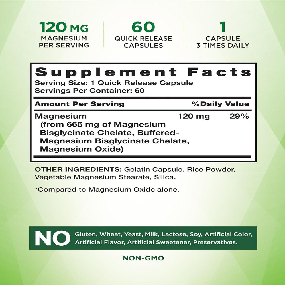 Nature's Truth's Magnesium Glycinate is scientifically crafted to deliver premium support at the highest level. Our scientifically-designed formula utilizes buffered chelated magnesium glycinate, which is more bioavailable than magnesium oxide alone. We utilize cutting edge technology to create Chelated Minerals that are readily bioavailable. Our Quick-Release capsules are specially formulated for high absorption and are soy free, gluten free, and dairy free. Now a single daily serving is all you need to receive pure minerals at the best value. Expect nothing less with Nature's Truth.