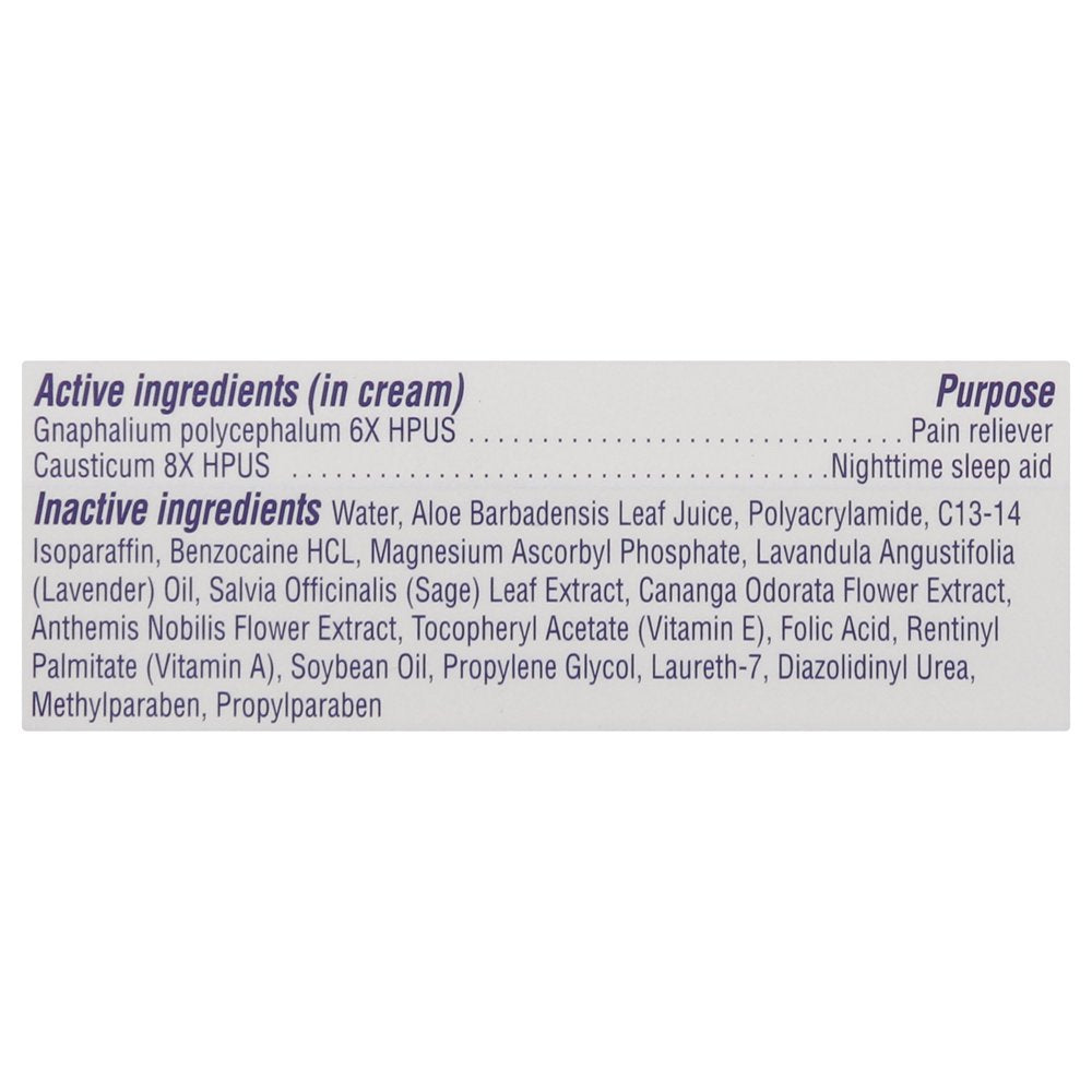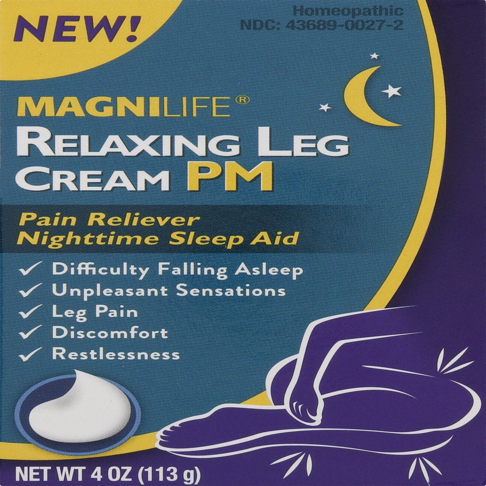 - Pain reliever. Nighttime Sleep Aid. New! Homeopathic. Difficulty falling asleep. Unpleasant sensations. Leg pain. Discomfort. Restlessness. Try Magnilife relaxing leg cream pm. Non-greasy, deep penetrating cream. Fast-acting relief. Allows for a good night's sleep. Non-habit forming. Difficulty falling asleep? Nighttime sleep aid for sleeplessness and restless tossing. Controls leg pain and discomfort so you can fall asleep fast. Added essential oils for relaxation. www.magnilife.com. Please recycle. Disclaimer: This homeopathic product has not been evaluated by the Food and Drug Administration for safety or efficacy. FDA is not aware of scientific evidence to support homeopathy as effective. Made in USA. Other information: The letter "HPUS" indicate that the components in this product are officially monographed in the Homeopathic Pharmacopeia of the United States. These statements are supported by traditional homeopathic principles.