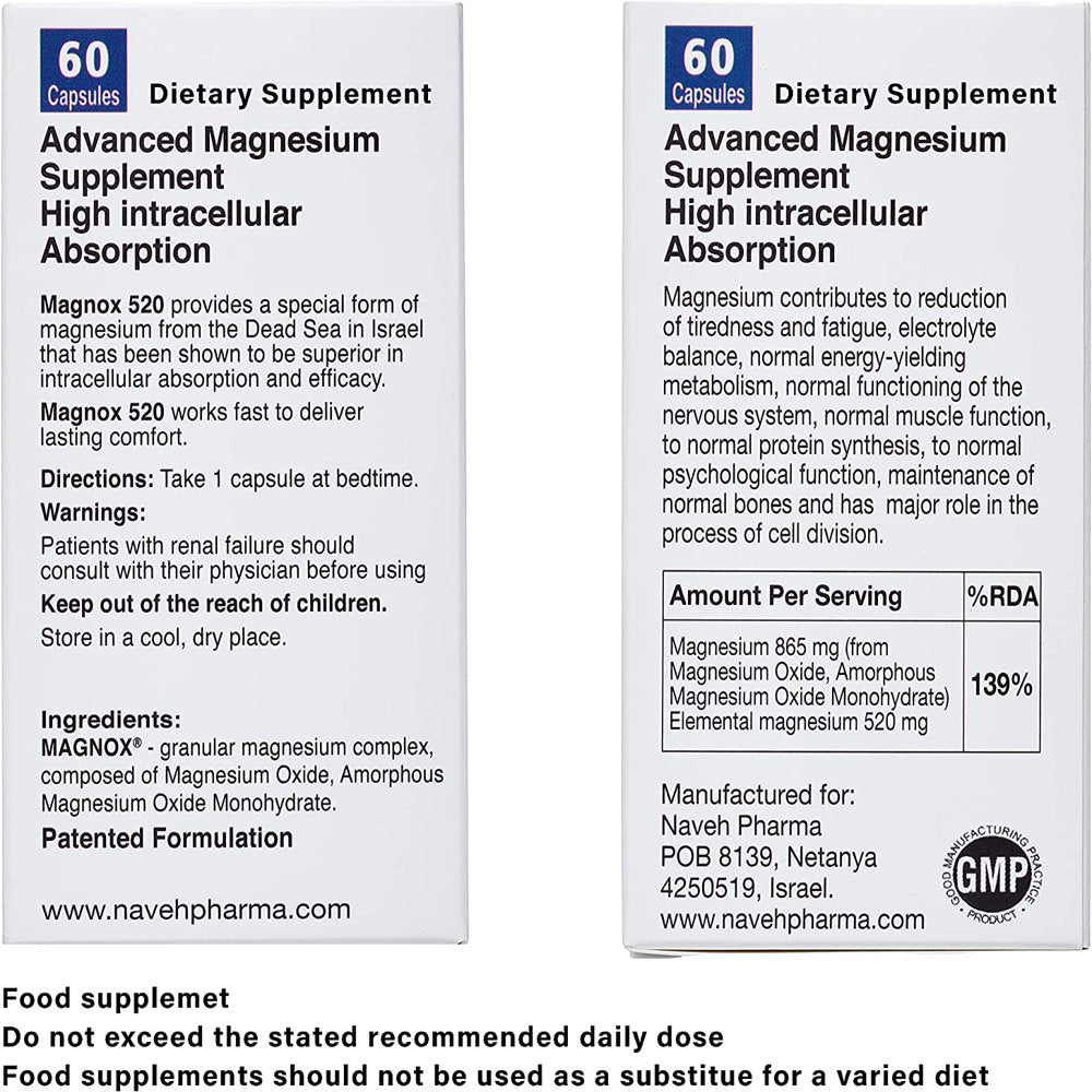 Get instant and much-needed relief, with the help of our vegan, kosher, and gluten free magnesium supplement for women and men. The Magnox 520 mg magnesium pills are composed of our patented, highly-quality magnesium minerals from water and salt of the dead sea. This magnesium complex supplement for Hypomagnesemia help to create energy, build bone strength and joint support, help nerves work properly, keep blood pressure in check, maintain heart health, support your sleep, decrease muscle spasms and leg cramps, provide immune support, and give long-term muscle relief without any side effects. Our magnesium for sleep is also effective for people with gastrointestinal issues, kidney distress, Crohn’s Disease, Celiac Disease, and Type 2 Diabetes. These dietary supplements work great as leg cramp pills and over the counter muscle relaxer. Each bottle contains 60 magnesium caps with a recommended dosage of 1 tablet a day. A great addition to first aid kits, these sleep aids do not contain any medicine, salt, sugar, or additives, making it safe for pregnant women and elderly people.- ONE-DOSE WONDER - The Magnox 520 mineral supplements nourish and re-energize your body with just one cap a day. The bottle contains 60 magnesium capsules and each capsule contains 520 mg of our patented magnesium.
