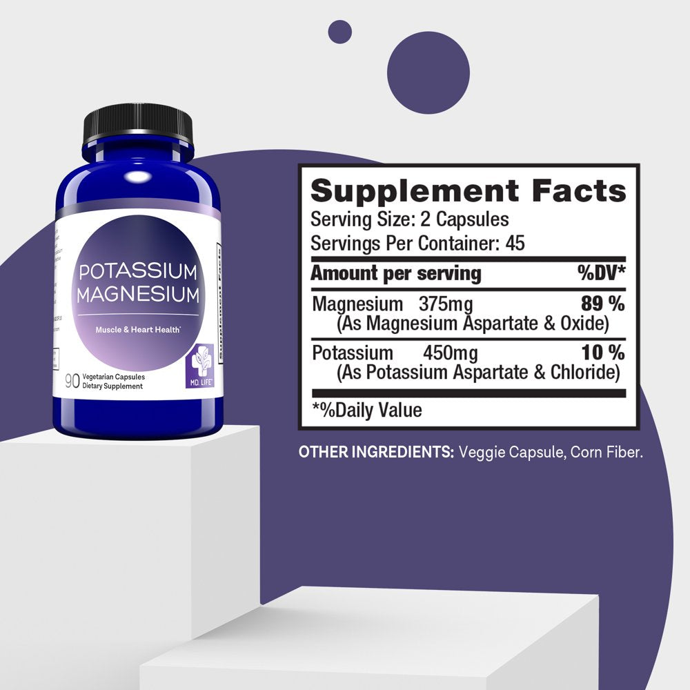 MD. Life Magnesium Potassium Supplement - 90 Ct - High Absorption Magnesium Complex Magnesium and Potassium for Vascular Health, Leg Cramps, Magnesium for Sleep, Non-Gmo