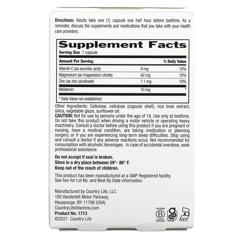 Melatonin 10 Mg Magnesium, Zinc & Vitamin C, 60 Vegan Capsules, Country Life