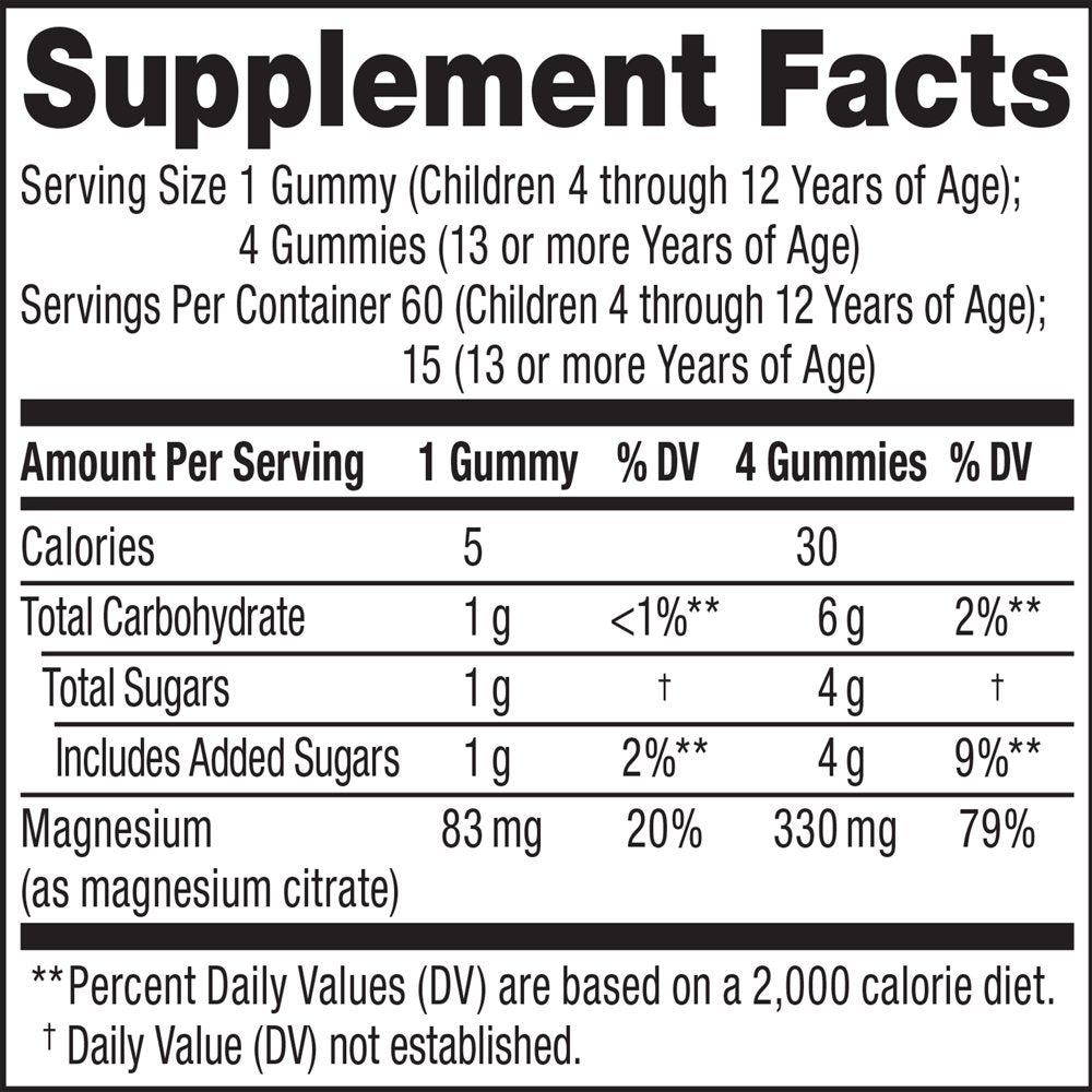 Magnesium (as magnesium citrate). Other ingredients: Organic tapioca syrup, organic cane sugar, water, citric acid, agar, organic tapioca starch, natural flavors, organic annatto extract (color), locust bean gum./div>