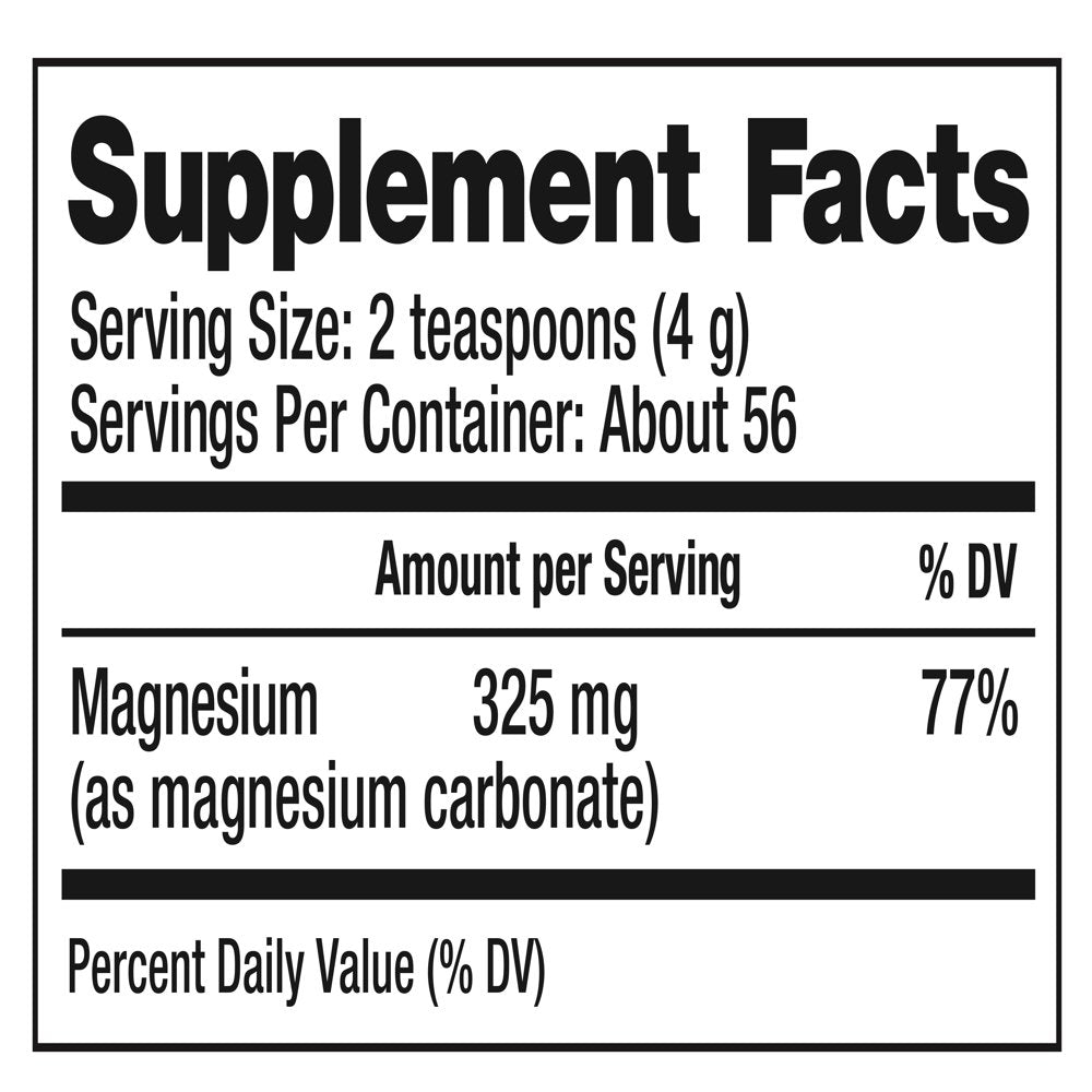 - EASY TO PREPARE: Start with half teaspoon (1g) daily and gradually increase to two teaspoons (4g) per day as needed. Place the magnesium powder supplement in a glass or mug, add water, let it fizz, then stir until dissolved and you’re one cup away from a calm experience. Can be taken with or without food