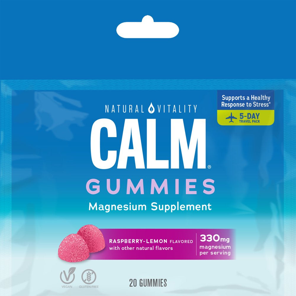 - DIETARY SUPPLEMENT: One travel pack of 20 Natural Vitality CALM Gummies Magnesium Supplement, designed to help support a balanced mood and a healthy response to stress (1)