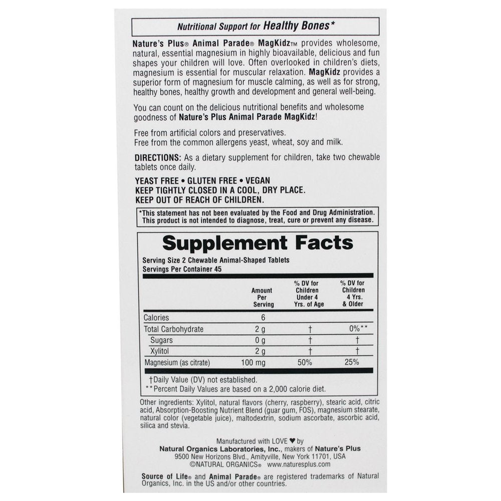 Sugar Free Sweetened with Xylitol Certified Non-GMO Chewable Supplement Nutritional Support for Healthy Bones Yeast Free- Gluten Free- Vegan Nature's Plus Animal Parade MagKidz provides wholesome, natural, essential magnesium in highly bioavailable, delicious and fun shapes your children will love. Often overlooked in children's diets, magnesium is essential for muscular relaxation. MagKidz provides a superior form of magnesium for muscle calming, as well as for strong, healthy bones, healthy growth and development and general well-being. You can count on the delicious nutritional benefits and wholesome goodness of Nature's Plus Animal Parade MagKidz!