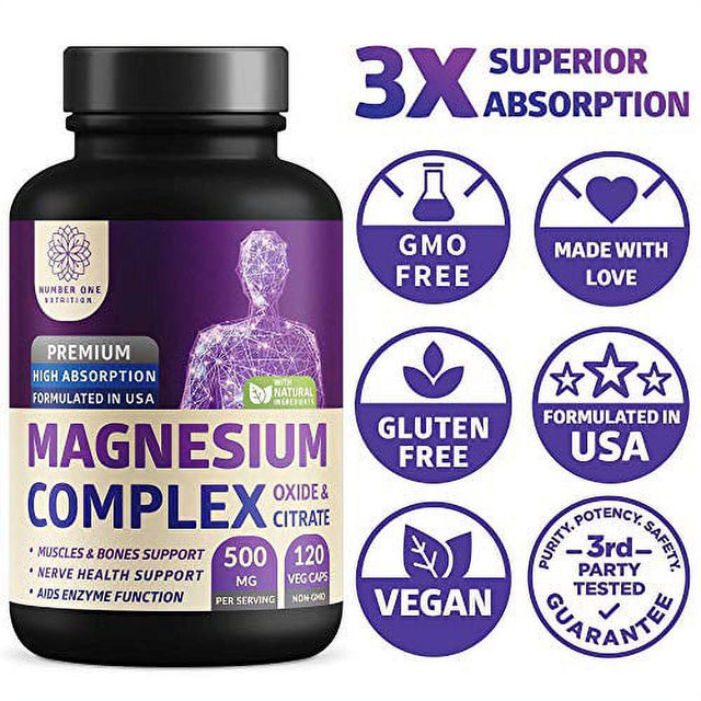 POWER-PACKED MAGNESIUM COMPLEX SUPPLEMENT. Made with 500mg concentrated magnesium for a high quality and potent blend that is convenient and easy to swallow. Our extra strength formula provides maximum absorption to support muscle, bone and nerve health with no added preservatives.PROMOTES DEEPER SLEEP AND RELAXATION. Each capsule contains potent magnesium citrate that has calming properties to help your mind and body relax for a restful and restorative sleep. Healthy levels of magnesium also helps in mineral absorption to relieve muscle tension and prevent cramps and spasms.IMPROVES BONE DENSITY AND RESTORES BONE HEALTH. Regular intake of our magnesium supplement will help in the absorption and metabolism of key nutrients and minerals like Calcium and Potassium in the body, essential in building stronger bones and greater bone density.SUPPORTS HEALTHY HEART, BLOOD SUGAR AND DIGESTION. The premium blend of magnesium citrate and oxide in every capsule will help relax blood vessels, regulate blood pressure and boost energy production. It also aids enzyme function and eases constipation.3X STRENGTH & EXCELLENT BIOAVAILABILITY. Our vegetarian formula helps in the fast absorption of minerals to promote cardiovascular health and muscle recovery. Made in the USA in a registered facility that adopts GMP to ensure quality & potency. Don't let your health wait! Order yours and feel better today!