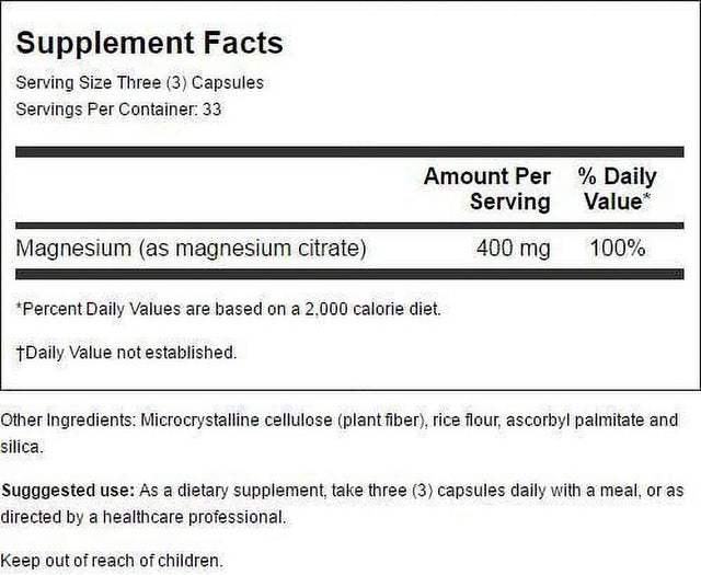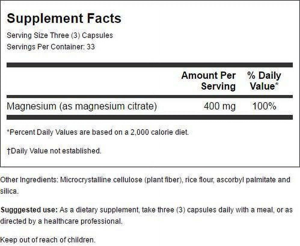 400 mg Per Serving Non GMO Vegan Gluten Free Essential Mineral for Heart & Bone Health Supports Muscle & Nerve Function Highly Absorbable Dietary Supplement Allergen Free One of the most taken supplements today is magnesium citrate. It is an antidote to stress, the most powerful relaxation mineral available, and it can help improve sleep. Magnesium is one of the most abundant minerals in soft tissues and is a vital catalyst in enzyme health. Magnesium supports in maintaining healthy energy levels and proper calcium absorption. A significant portion of the general population has a magnesium deficiency. Many eat a a highly-processed, refined diet that is based mostly on white flour, meat, and dairy (all of which have no magnesium). Magnesium functions in the conversion of carbohydrates, protein, and fats to energy and also helps in the regulation of blood pressure and blood glucose levels.