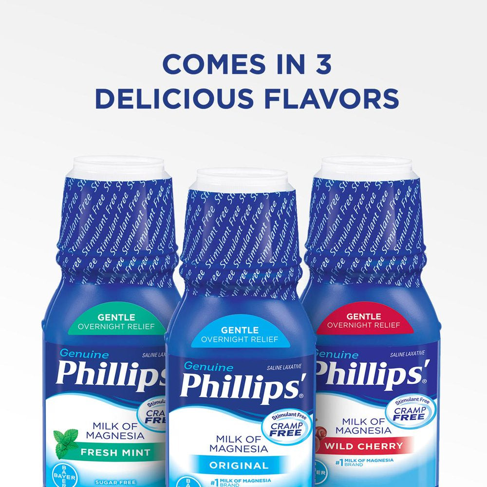 - Phillips' Milk of Magnesia Fresh Mint Flavor liquid laxative works with the body's natural process to relieve occasional constipation and helps you get back to regular.