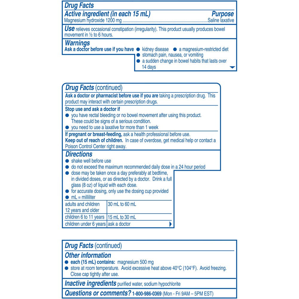 - Phillips Milk Of Magnesia Liquid Laxative, Original, 12 Fl Oz: Phillips Milk of Magnesia Original Flavor liquid laxative works with the body's natural process to relieve occasional constipation and helps you get back to regular.