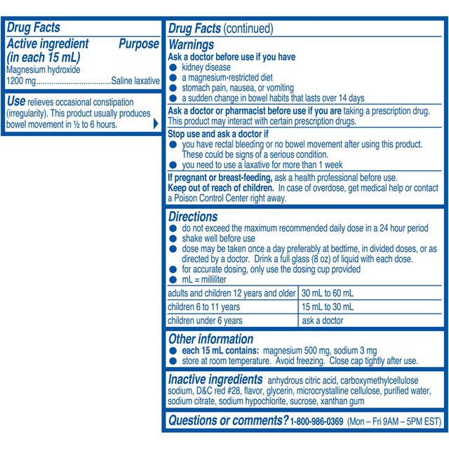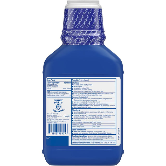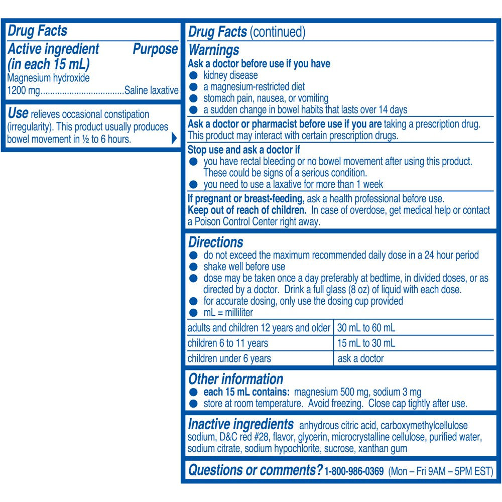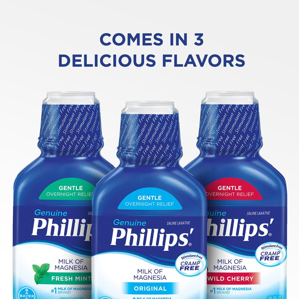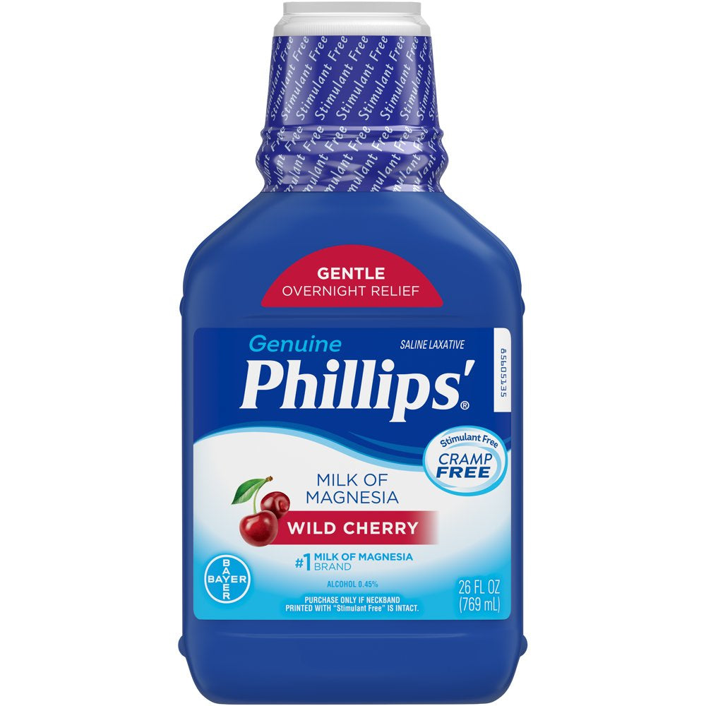 Get fast, stimulant-free and cramp-free relief from occasional constipation with Phillips Milk of Magnesia Laxative. Phillips' Milk of Magnesia Wild Cherry Flavor liquid laxative works with the body's natural process to relieve occasional constipation and helps you get back to regular. Formulated with Magnesium Hydroxide, Phillips' Milk of Magnesia offers cramp-free, gentle relief of occasional constipation without the use of harsh stimulants. Gives you gentle, overnight relief. This classic, medicine-cabinet standard is available in three soothing liquid flavors: Original, Wild Cherry, and Fresh Mint.