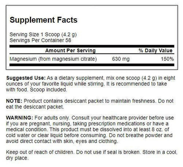 Magnesium 630 mg 150%,As a dietary supplement, mix one scoop (4.2 g) in eight ounces of your favorite liquid. It is recommended to take with food. Scoop included.,Consult your healthcare provider before use if you are pregnant, nursing, taking prescription medications or have a medical condition.,Product contains desiccant packet to maintain freshness. Do not eat the desiccant packet./div>