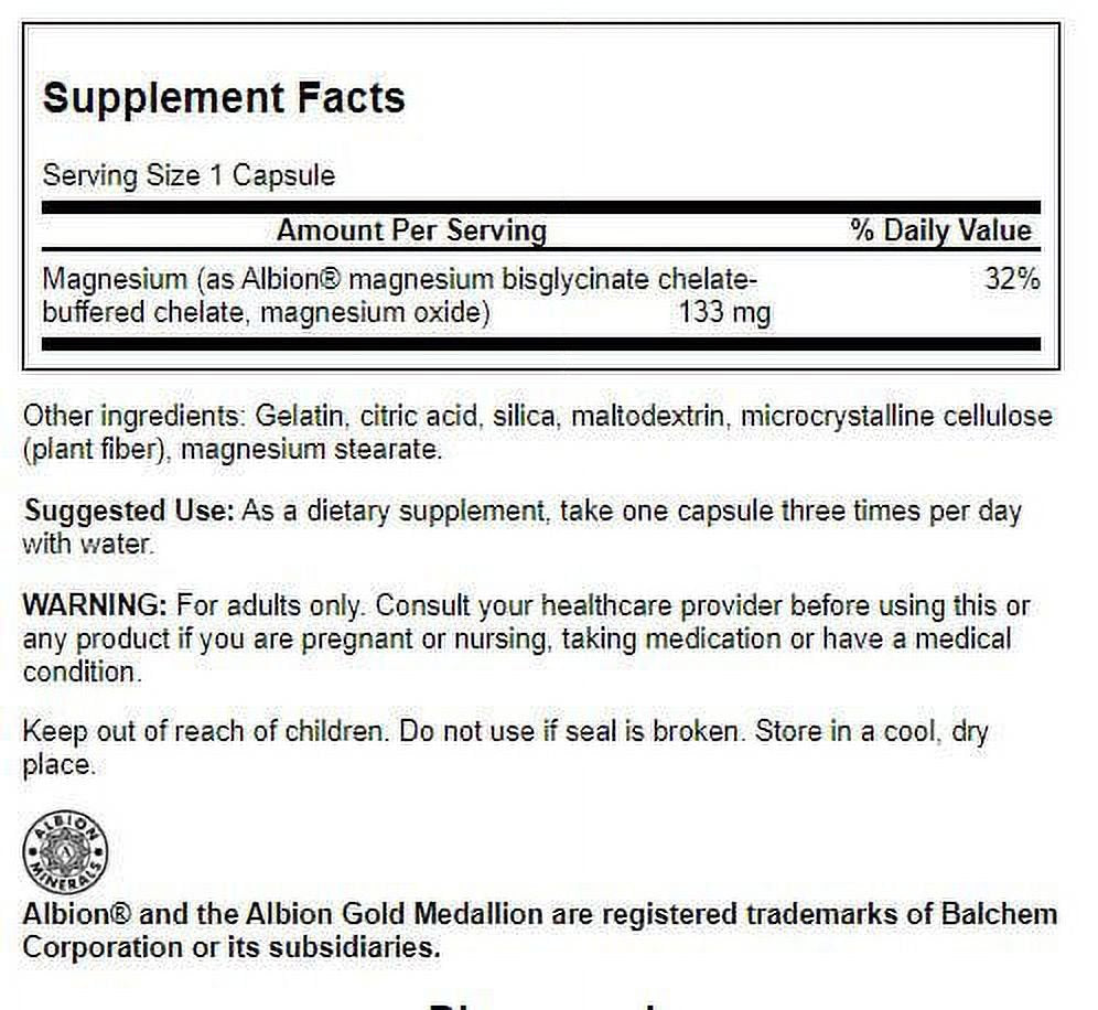 Swanson Albion Chelated Magnesium delivers mineral support you can count on for healthy muscles, nerves, bones and more. Magnesium also offers cardiovascular support and promotes healthy blood pressure levels. Each capsule contains 133 mg of Albion(R) amino acid chelated magnesium. What Makes Chelated Mineral Glycinates So Superior? First we need to understand the chelation process. Chelation is the result of minerals becoming chemically bound to amino acids in a very specific manner. Chelation occurs during the digestive process to facilitate transport of minerals across the intestinal wall so that they may be utilized throughout the body. Amino acids are not the only "chelators" available, but they are ideal for minerals. The body is very efficient at absorbing individual amino acids, and Albion has identified the amino acid glycine as the preferred molecule for creating organic chelated minerals. Glycine is readily identified and absorbed across the intestinal wall, and Albion's