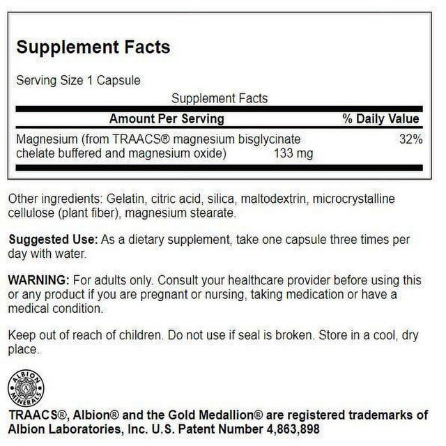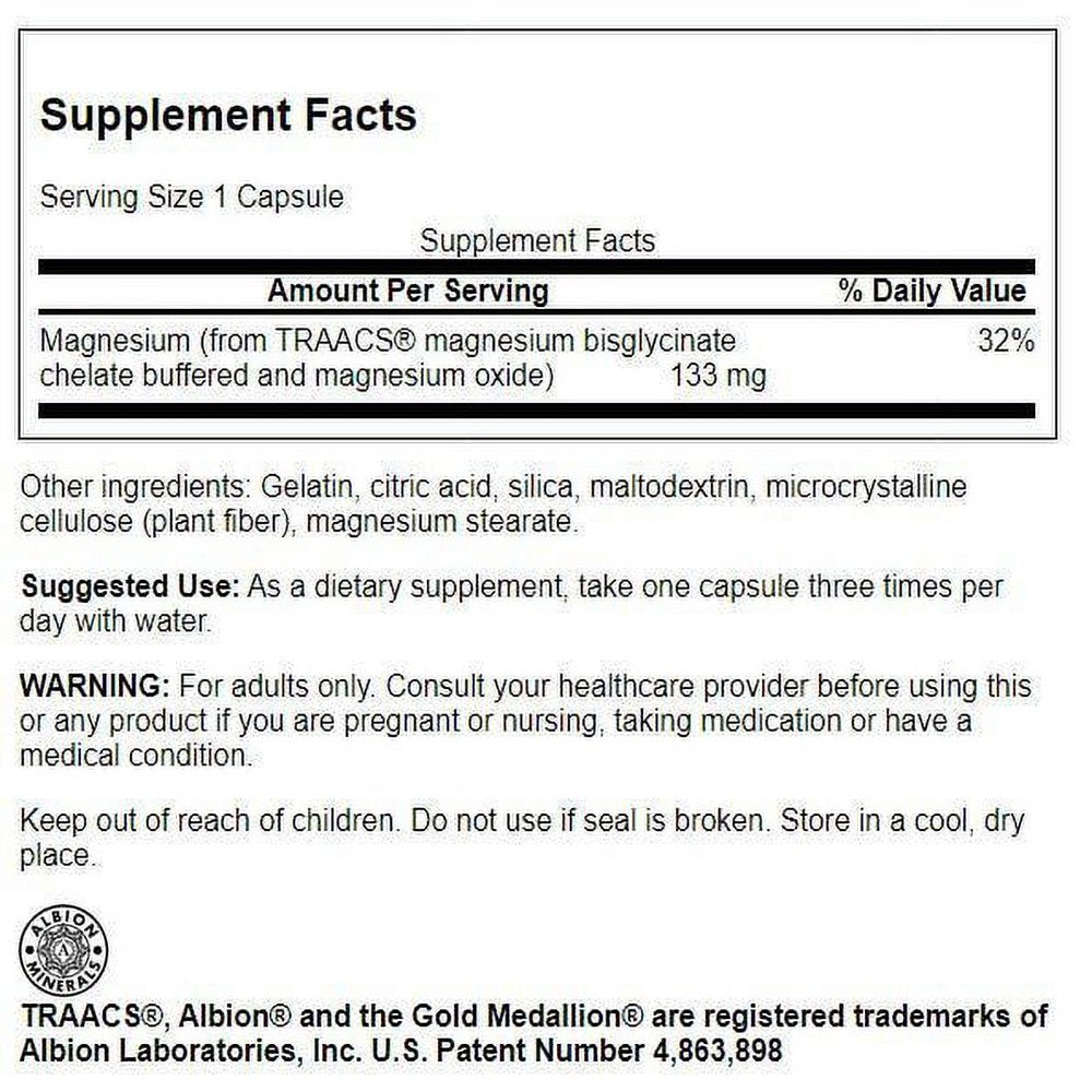 Swanson Albion Chelated Magnesium delivers mineral support you can count on for healthy muscles, nerves, bones and more. Magnesium also offers cardiovascular support and promotes healthy blood pressure levels. Each capsule contains 133 mg of Albion(R) amino acid chelated magnesium. What Makes Chelated Mineral Glycinates So Superior? First we need to understand the chelation process. Chelation is the result of minerals becoming chemically bound to amino acids in a very specific manner. Chelation occurs during the digestive process to facilitate transport of minerals across the intestinal wall so that they may be utilized throughout the body. Amino acids are not the only "chelators" available, but they are ideal for minerals. The body is very efficient at absorbing individual amino acids, and Albion has identified the amino acid glycine as the preferred molecule for creating organic chelated minerals. Glycine is readily identified and absorbed across the intestinal wall, and Albion's