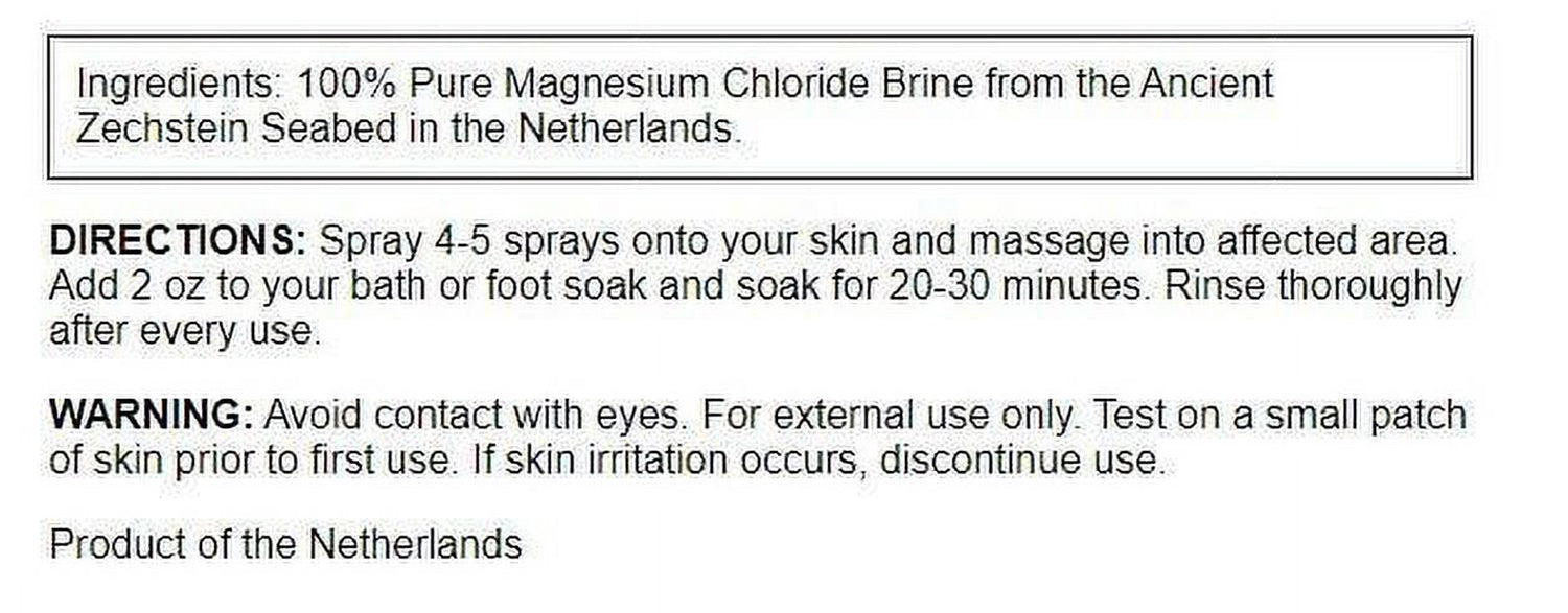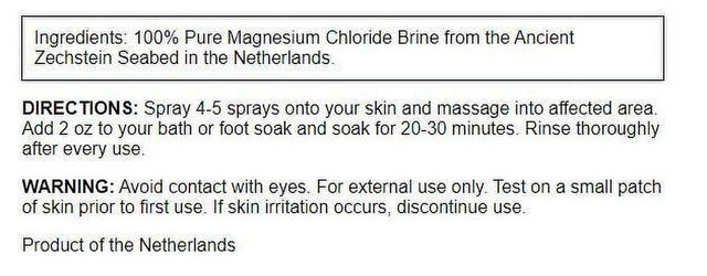 Ingredients: 100% Pure Magnesium Chloride Brine from the Ancient Zechstein Seabed in the Netherlands.,Spray 4-5 sprays onto your skin and massage into affected area. Add 2 oz to your bath or foot soak and soak for 20-30 minutes. Rinse thoroughly after every use.,Avoid contact with eyes. For external use only. Test on a small patch of skin prior to first use. If skin irritation occurs, discontinue use.,Product of the Netherlands/div>