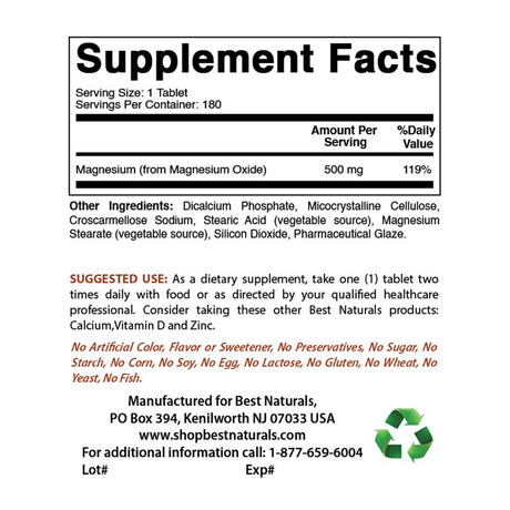 Best Naturals Magnesium Oxide 500 Mg 180 Tablets