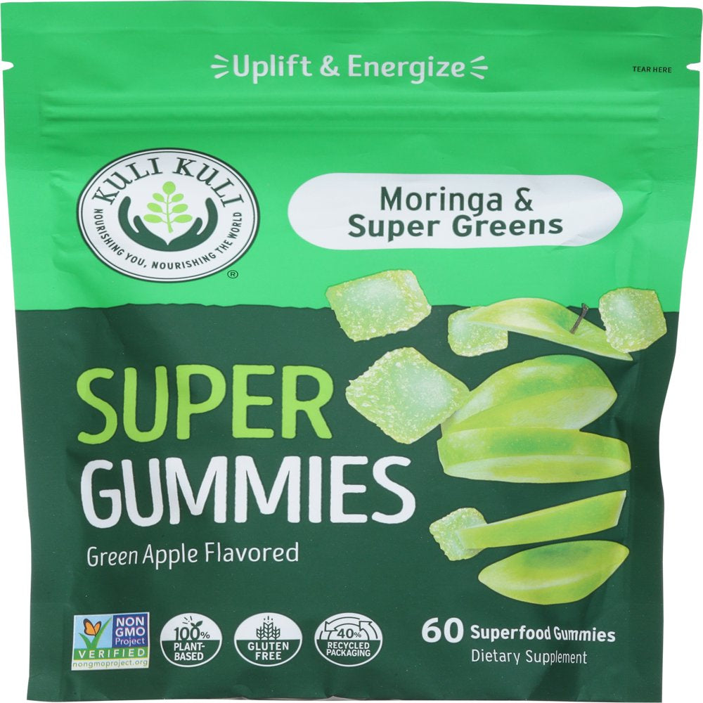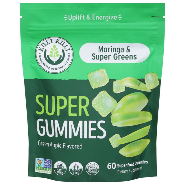 - Dietary Supplement. Gluten free. Non-GMO Project verified. nongmoproject.org. Uplift & energize. Nourishing you, nourishing the world. 100% plant-based. Superfoods Made Super Tasty: Super Gummies make it easy to get your daily fix of nutritious and sustainable superfoods in a delicious, plant-based gummy. Sneak in your daily greens with this blend of powerful plants. Meet Moringa: The most nutrient-rich revitalizing, good-for-you green on the planet. Meet Super Greens: An invigorating blend of nourishing greens, including wheatgrass, spinach, spirulina and alfalfa. kulikulifoods.com. Follow (at)kulikulifoods. Instagram; Pinterest; Facebook. Learn more about our deliciously impactful superfoods at kulikulifoods.com. Certified B Corporation. 40% recycled packaging. (These statement has not been evaluated by the Food and Drug administration. This product is not intended to diagnose, treat, cure or prevent any disease.)