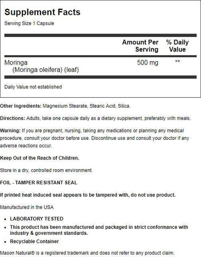MASON NATURAL Moringa 500 mg is a potent herbal supplement promoting energy metabolism, immune support, and a healthy inflammatory response. Derived from the nutrient-rich Moringa oleifera plant, each 60-capsule bottle provides a concentrated dose of this botanical marvel. Boost your vitality naturally with Moringa's energy-enhancing properties while supporting overall well-being. Please note that this statement has not been evaluated by the FDA, and the product is not intended to diagnose, treat, cure, or prevent any disease. Elevate your health with MASON NATURAL Moringa 500 mg. Visit the MASON NATURAL Store for more.