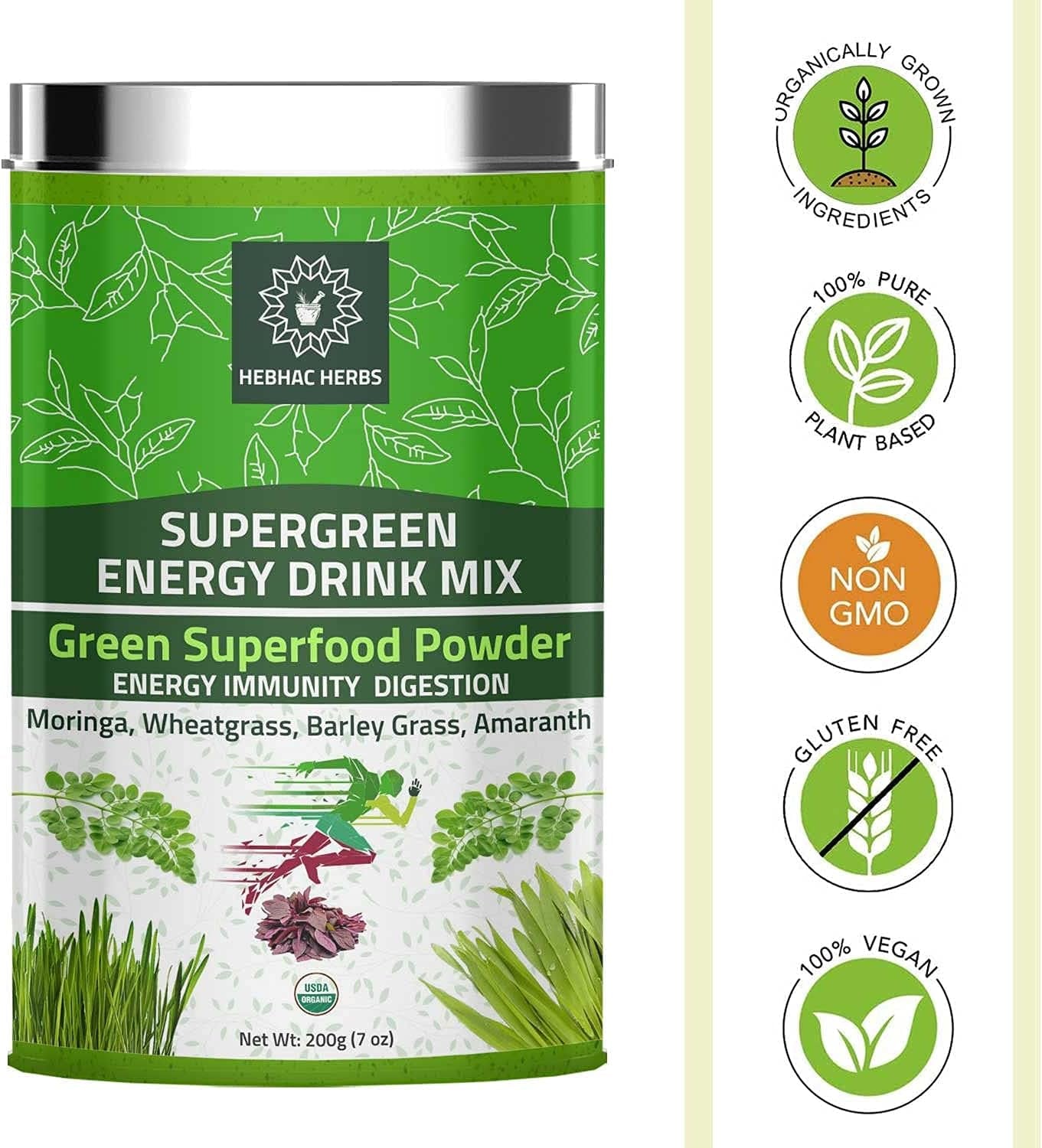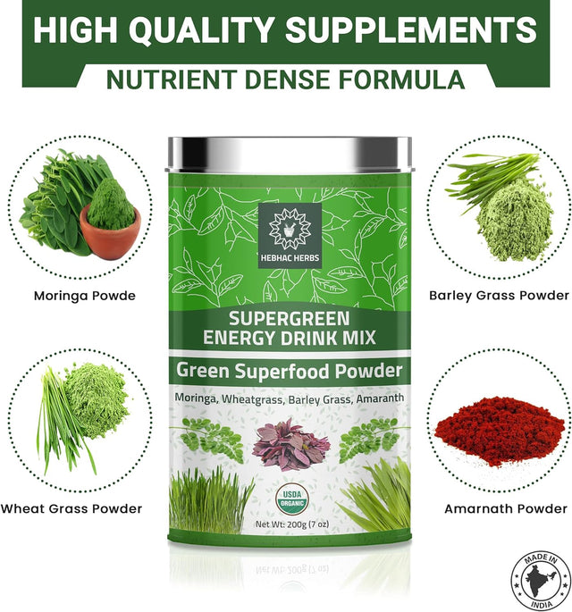 Organic Super Green Energy Drink Mix 200G (7 Oz) Moringa Powder, Wheat Grass Powder, Barley Grass Powder, Amaranth Powder, Greens Superfood Detox Powder, Natural Energy Drink Mix 200G