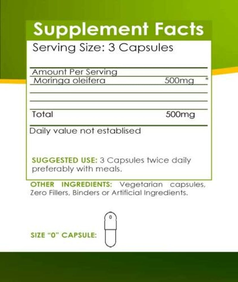 Dosage: It is recommended to take 3 capsules twice daily preferable with food. TIPS ABOUT MORINGA CAPSULES Moringa, sometimes described as the “miracle tree,” “drumstick tree,” or “horseradish tree,” has small, rounded leaves that are packed with an incredible amount of nutrition: protein, calcium, beta carotene, vitamin C, potassium.. you name it, moringa’s got it. No wonder it’s been used medicinally (and as a food source) for at least 4,000 years. Moringa supplement can be used as source of antioxidant and to lower cholesterol. A Rich Nutritional Profile Moringa leaves are loaded with vitamins, minerals, essential amino acids, and more. One hundred grams of dry moringa leaf contains:9 times the protein of yogurt10 times the vitamin A of carrots15 times the potassium of bananas17 times the calcium of milk12 times the vitamin C of oranges25 times the iron of spinach Lower Blood Sugar Levels Moringa appears to have anti-diabetic effects, likely due to beneficial plant compounds contained in the leaves, including isothiocyanates. One study found women who took seven grams of moringa leaf powder daily for three months reduced their fasting blood sugar levels by 13.5 percent. Separate research revealed that adding 50 grams of moringa leaves to a meal reduced the rise in blood sugar by 21 percent among diabetic patients. NUTRITIONAL BENEFITS Lower Blood Sugar Levels Reduce Inflammation Maintain Healthy Cholesterol Levels Rich in Antioxidants Protect against Arsenic Toxicity These statements have not been evaluated by the Food & Drug Administration. These products are not intended to diagnose, treat, cure, or prevent any disease.