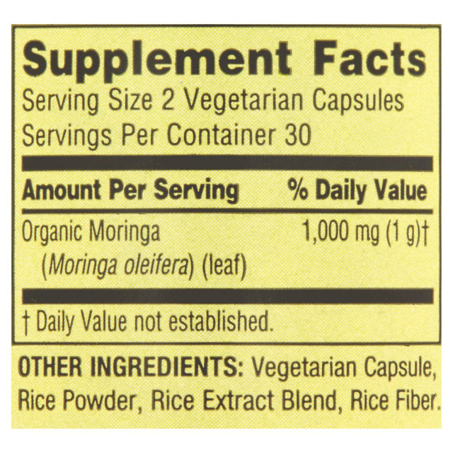 Spring Valley Moringa Oleifera Dietary Supplement, 1,000 mg is a supplement designed to provide antioxidant support. Moringa oleifera is a superfood herb that is a source of antioxidants. The suggested adult dosage is simply two vegetarian capsules daily, preferably with a meal. These capsules are free of gluten, yeast, wheat, milk or milk derivatives, lactose, sugar, preservatives, soy, artificial color, and artificial flavor, and contain less than 5 milligrams of sodium per serving. You can rest assured that Spring Valley Moringa Oleifera Dietary Supplement, 1,000 mg, is produced with strict quality guidelines and is backed by our quality guarantee.