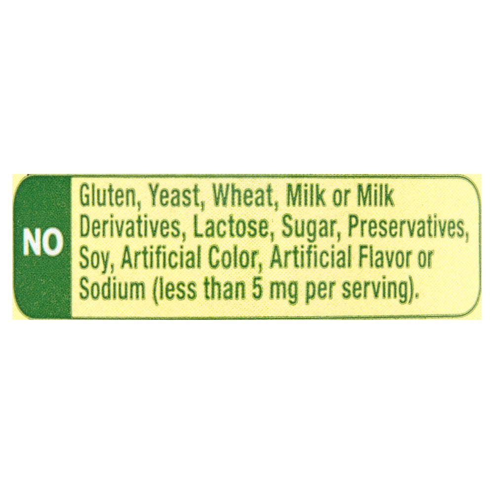 No gluten, yeast, wheat, milk or milk derivatives, lactose, sugar, preservatives, soy, artificial color, artificial flavor or sodium (less than 5 mg per serving).