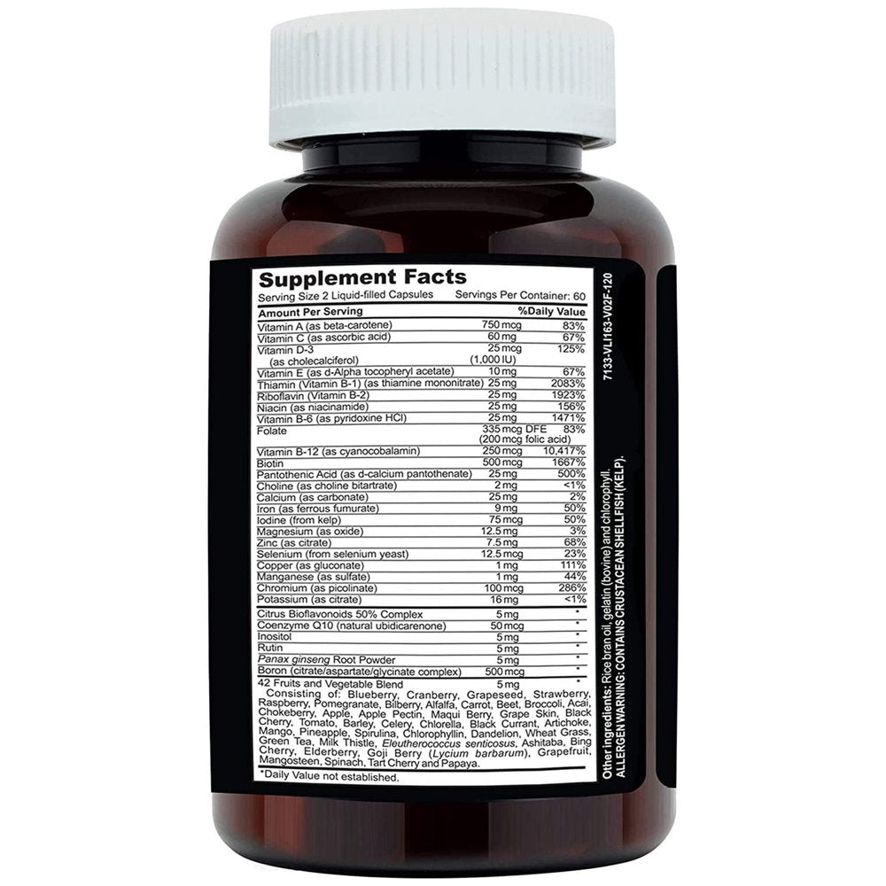 - Complete multivitamins for adults with 120 liquid capsules per bottle.