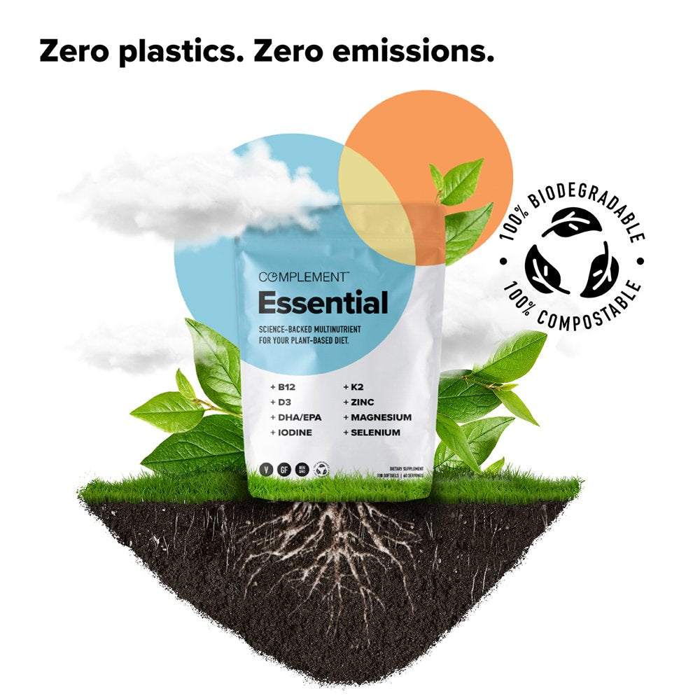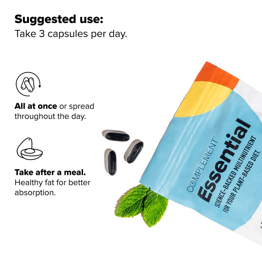 Complement Essentials is a multivitamin for vegans and plant based easters. Specifically designed to support your plant-based diet with the 8 missing or hard-to-get nutrients including Vitamin B12, Vitamin D3, Vitamin K2, Iodine, Magnesium, Selenium, Zinc and DHA/EPA. Optimize your foundational health with the 8 critical vitamins, minerals, and sustainably-sourced omega-3s proven hard-to-get through a plant-based diet alone — all in one easy-to-take capsule.