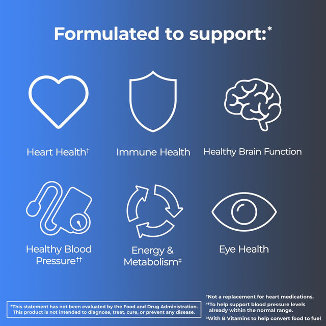 • Formulated to support heart health?, healthy blood pressure**, immune health, eye health, and physical energy by helping convert food to fuel *