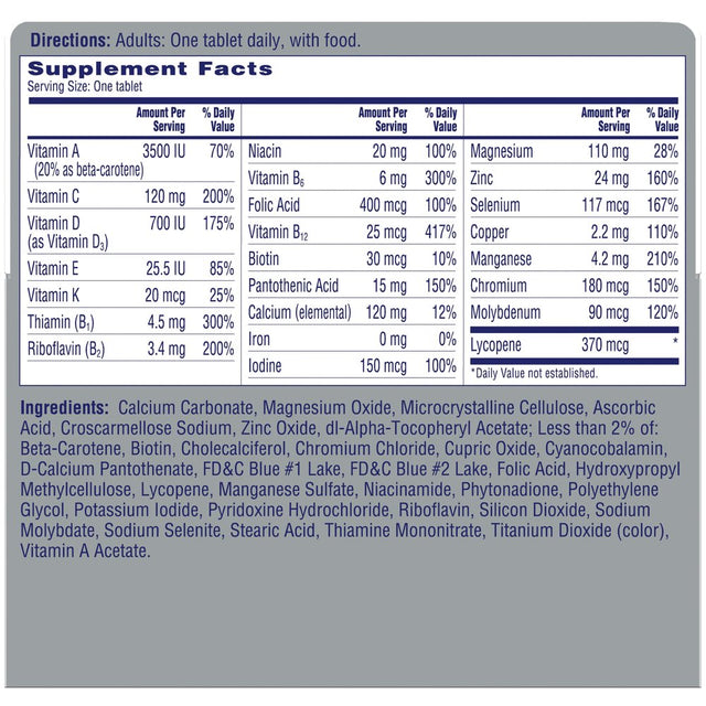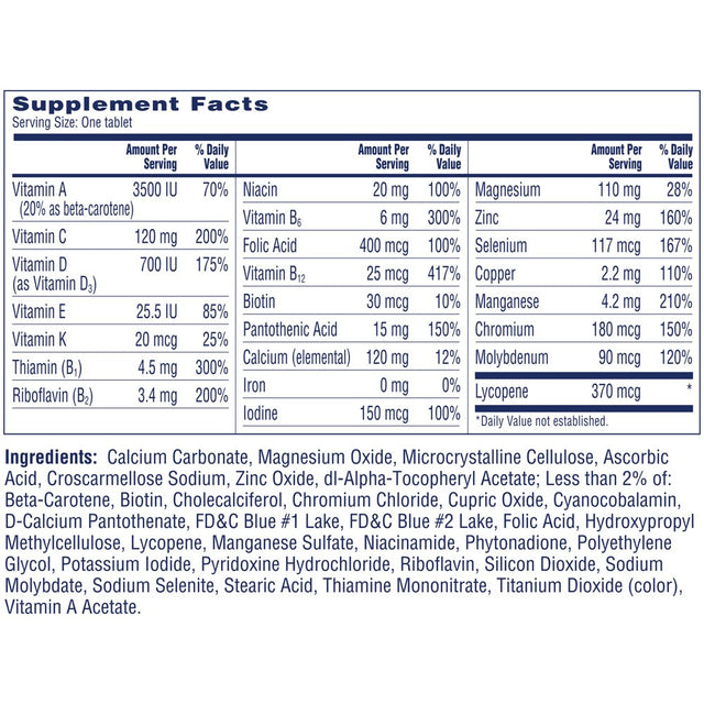 Calcium Carbonate, Magnesium Oxide, Microcrystalline, Cellulose, Ascorbic Acid, Croscarmellose Sodium, Zinc Oxide, Dl-Alpha-Tocopheryl Acetate, Less than 2% of Beta-Carotene, Biotin, Cholecalciferol, Chromium Chloride, Cupric Oxide, Cyanocobalamin, D-Calcium Pantothenate, FD&C Blue 1 Lake, FD&C Blue 2 Lake, Folic Acid, Hydroxypropyl Methylcellulose, Lycopene, Manganese Sulfate, Niacinamide, Phytonadione, Polyethylene Glycol, Potassium Iodide, Pyridoxine Hydrochloride, Riboflavin, Silicon Dioxide, Sodium Molybdate, Sodium Selenite, Stearic Acid, Thiamine Mononitrate, Titanium Dioxide (Color), Vitamin A Acetate./div>