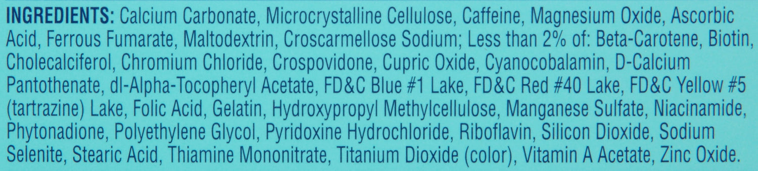 Calcium Carbonate, Microcrystalline Cellulose, Caffeine, Magnesium Oxide, Ascorbic Acid, Ferrous Fumarate, Guarana Seed Powder, Crospovidone; Less than 2% of: Beta-Carotene, Biotin, Cholecalciferol, Chromium Chloride, Croscarmellose Sodium, Cupric Oxide, Cyanocobalamin, D-Calcium Pantothenate, dl-Alpha-Tocopheryl Acetate, FD&C Blue #1 Lake, FD&C Red #40 Lake, FD&C Yellow #5 (tartrazine) Lake, Folic Acid, Hydroxypropyl Methylcellulose, Manganese Sulfate, Niacinamide, Phytonadione, Polyethylene Glycol, Pyridoxine Hydrochloride, Riboflavin, Silicon Dioxide, Sodium Selenite, Stearic Acid, Thiamine Mononitrate, Titanium Dioxide (color), Vitamin A Acetate, Zinc Oxide./div>