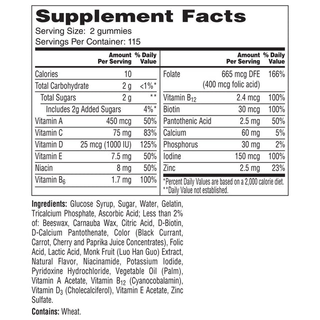 - Contains key nutrients like Vitamins A, B12, B6 , C, D, E, Folic Acid, Biotin,1 Iodine, Zinc, and Calcium
