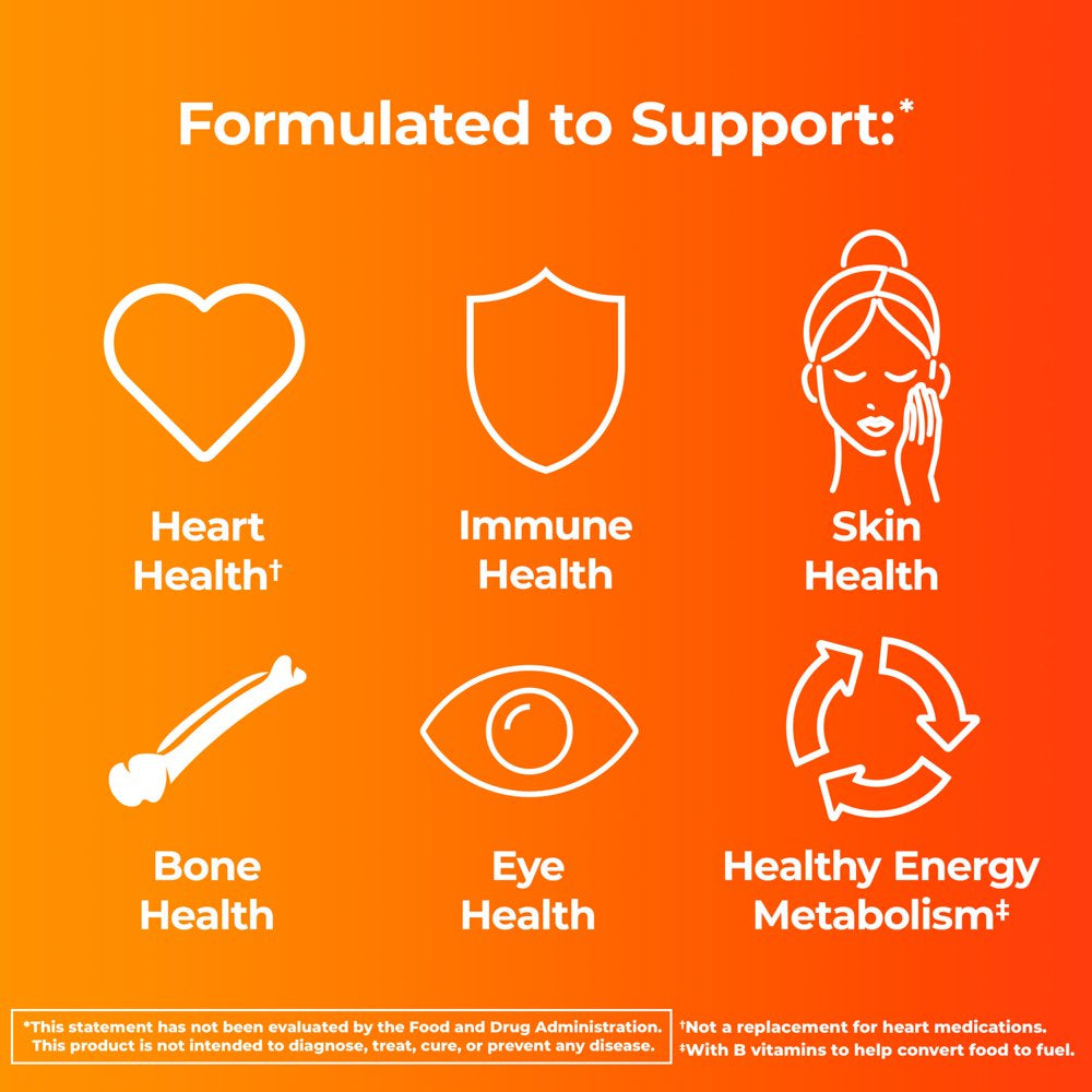 - FORMULATED TO SUPPORT:* Heart Health†, Healthy Energy Metabolism‡, Healthy Muscle Function and Immune, Skin, Bone and Eye Health