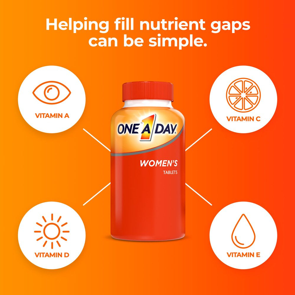Specially designed for women, One A Day Women's Complete Multivitamin is 40% smaller** for simple daily dosing. One A Day Women's Complete Multivitamin contains essential nutrients such as Vitamin A, Vitamin C, Vitamin D, Vitamin E, Biotin and Zinc, as well as Vitamin B6, Vitamin B12, Pantothenic Acid, Folate, Riboflavin, Niacin and Thiamin. From the #1 multivitamin brand specially designed for women, One A Day Women's Complete Multivitamin contains at least 100% Daily Value of 14 essential nutrients for your wellness support*. Taking one multivitamin every day with food provides key nutrients to support:* Heart Health†, Healthy Energy Metabolism‡, Healthy Muscle Function as well as Immune, Skin, Bone and Eye Health. Our multivitamin for women is free of High Fructose Corn Syrup, Fish/Crustacean Shellfish Allergens and Artificial Flavors and Sweeteners. One A Day Women's Complete Multivitamin is a simple way to get nutritional support you may need. †Not a replacement for heart medications ‡ With B vitamins to help convert food to fuel **Compared to previous One A Day Women's Complete Multivitamin Tablet *This statement has not been evaluated by the Food and Drug Administration. This product is not intended to diagnose, treat, cure, or prevent any disease.