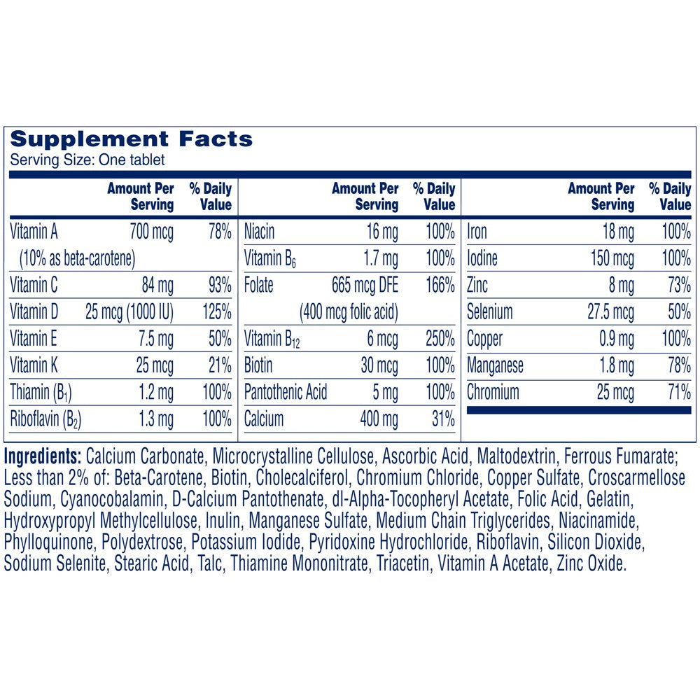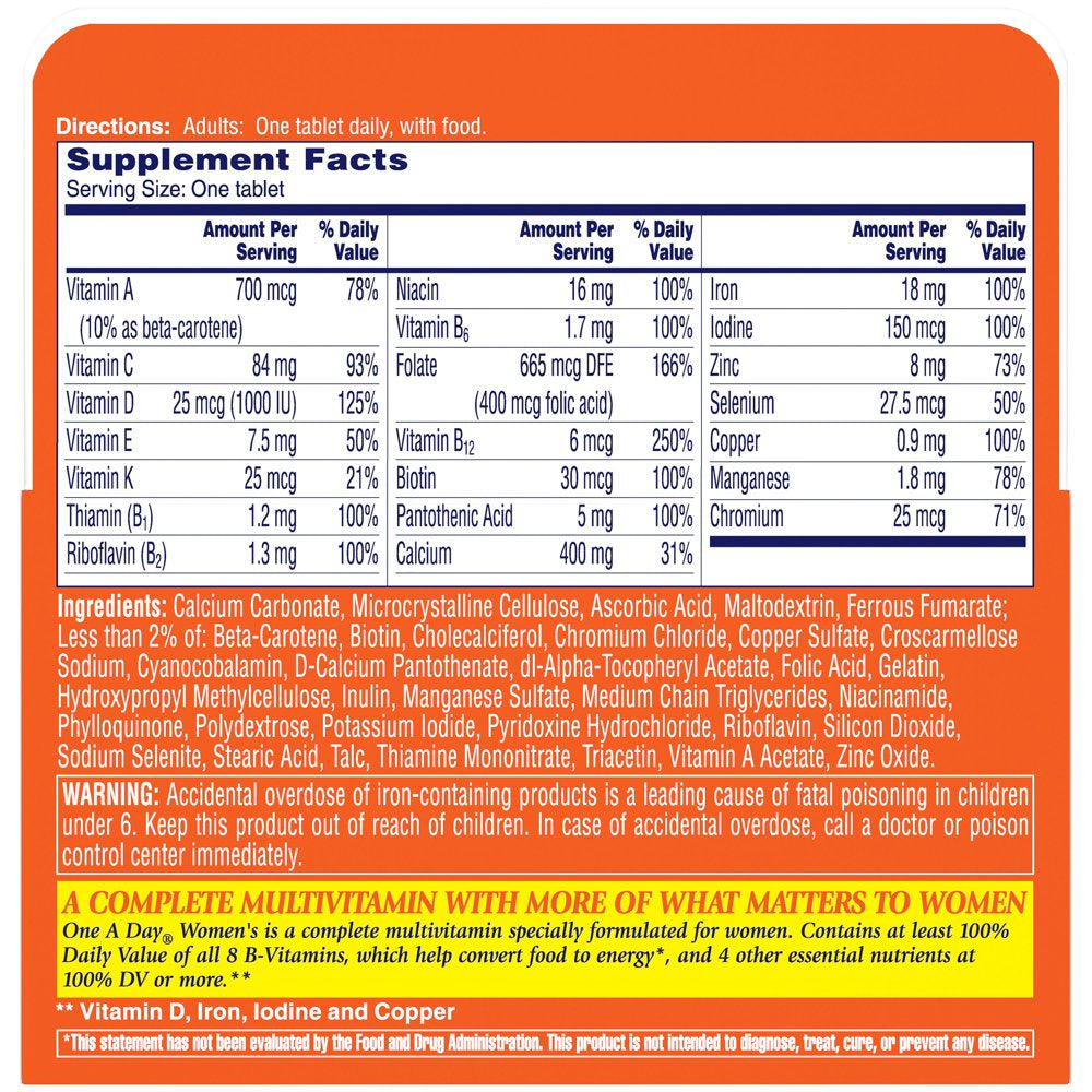 All the vitamins and minerals important to women in a single tablet.* One easy to take tablet contains Vitamins A, B6, B12, C, D, E, and K, Riboflavin, Thiamin, Niacin, Folic Acid, Pantothenic Acid, Iodine, Copper, Biotin, Iron, Selenium, Chromium, Calcium, Zinc, and Manganese. One A Day Women's Multivitamin is ideal for women who are proactive about their health.