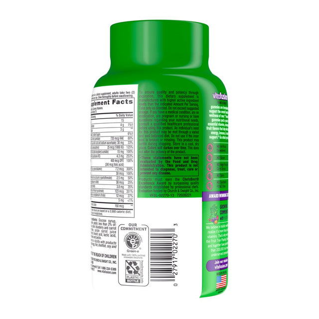 Vitafusion Adult Gummy Vitamins for Men are daily vitamins formulated to address the health needs of men(1). Each delicious two-gummy serving combines essential vitamins and minerals with natural fruit flavors to provide a great-tasting, convenient alternative to traditional, hard-to-swallow vitamin pills. Vitafusion believes that taste and nutrition can be fused together, ensuring that taking your men's daily multivitamin is an easy and delicious part of your day. Each serving provides immune system, muscle and energy metabolism support (1) and is an excellent source of Vitamin A, Vitamin C and Vitamin D. This daily multivitamin also contains Vitamins E, B6 and B12, along with Biotin, Zinc, Iodine and Folic Acid. These daily multivitamins for men contain no high-fructose corn syrup, no artificial sweeteners, no gluten, no dairy and no synthetic FD&C dyes. This 150-count bottle of vitamin gummies has enough for 75 days. Vitafusion is the only gummy vitamin brand with products that have been awarded the ChefsBest Excellence award for taste; vitafusion Adult Gummy Vitamins for Men were the recipient of the 2021 ChefsBest Excellence Award (2). Take a fruitful step toward a healthier, happier world with America’s #1 Gummy Vitamin Brand.(1) These statements have not been evaluated by the Food and Drug Administration. This product is not intended to diagnose, treat, cure or prevent any disease. (2) The ChefsBest Excellence Award is awarded to brands that surpass quality standards established by independent professional chefs. Evaluation funded by Church & Dwight Co., Inc.